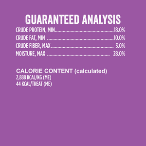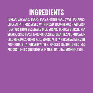 TURKEY, GARBANZO BEANS, PEAS, CHICKEN MEAL, SWEET POTATOES, CHICKEN FAT (PRESERVED WITH MIXED TOCOPHEROLS), GLYCERIN (DERIVED FROM VEGETABLE OIL), SUGAR, TAPIOCA STARCH, PEA STARCH, DRIED YEAST, GROUND FLAXSEED, GELATIN, SALT, POTASSIUM CHLORIDE, PHOSPHORIC ACID, SORBIC ACID (A PRESERVATIVE), ZINC PROPIONATE (A PRESERVATIVE), SMOKED BACON, DRIED EGG PRODUCT, DRIED CULTURED SKIM MILK, NATURAL SMOKE FLAVOR.Guaranteed Analysis