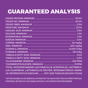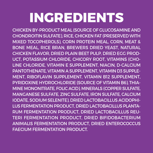 CHICKEN BY-PRODUCT MEAL (SOURCE OF GLUCOSAMINE AND CHONDROITIN SULFATE), RICE, CHICKEN FAT (PRESERVED WITH MIXED TOCOPHEROLS), CORN PROTEIN MEAL, CORN, MEAT & BONE MEAL, RICE BRAN, BREWERS DRIED YEAST, NATURAL CHICKEN FLAVOR, DRIED PLAIN BEET PULP, DRIED EGG PRODUCT, POTASSIUM CHLORIDE, CHICORY ROOT, VITAMINS (CHOLINE CHLORIDE, VITAMIN E SUPPLEMENT, NIACIN, D-CALCIUM PANTOTHENATE, VITAMIN A SUPPLEMENT, VITAMIN D3 SUPPLEMENT, RIBOFLAVIN SUPPLEMENT, VITAMIN B12 SUPPLEMENT, PYRIDOXINE HYDROCHLORIDE (SOURCE OF VITAMIN B6), THIAMINE MONONITRATE, FOLIC ACID), MINERALS (COPPER SULFATE, MANGANESE SULFATE, ZINC SULFATE, IRON SULFATE, CALCIUM IODATE, SODIUM SELENITE), DRIED LACTOBACILLUS ACIDOPHILUS FERMENTATION PRODUCT, DRIED LACTOBACILLUS PLANTARUM FERMENTATION PRODUCT, DRIED LACTOBACILLUS REUTERI FERMENTATION PRODUCT, DRIED BIFIDOBACTERIUM ANIMALIS FERMENTATION PRODUCT, DRIED ENTEROCOCCUS FAECIUM FERMENTATION PRODUCT.Guaranteed Analysis