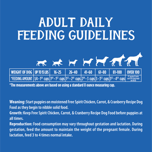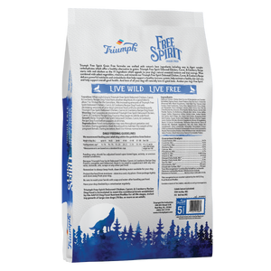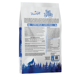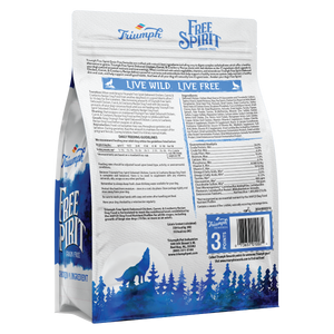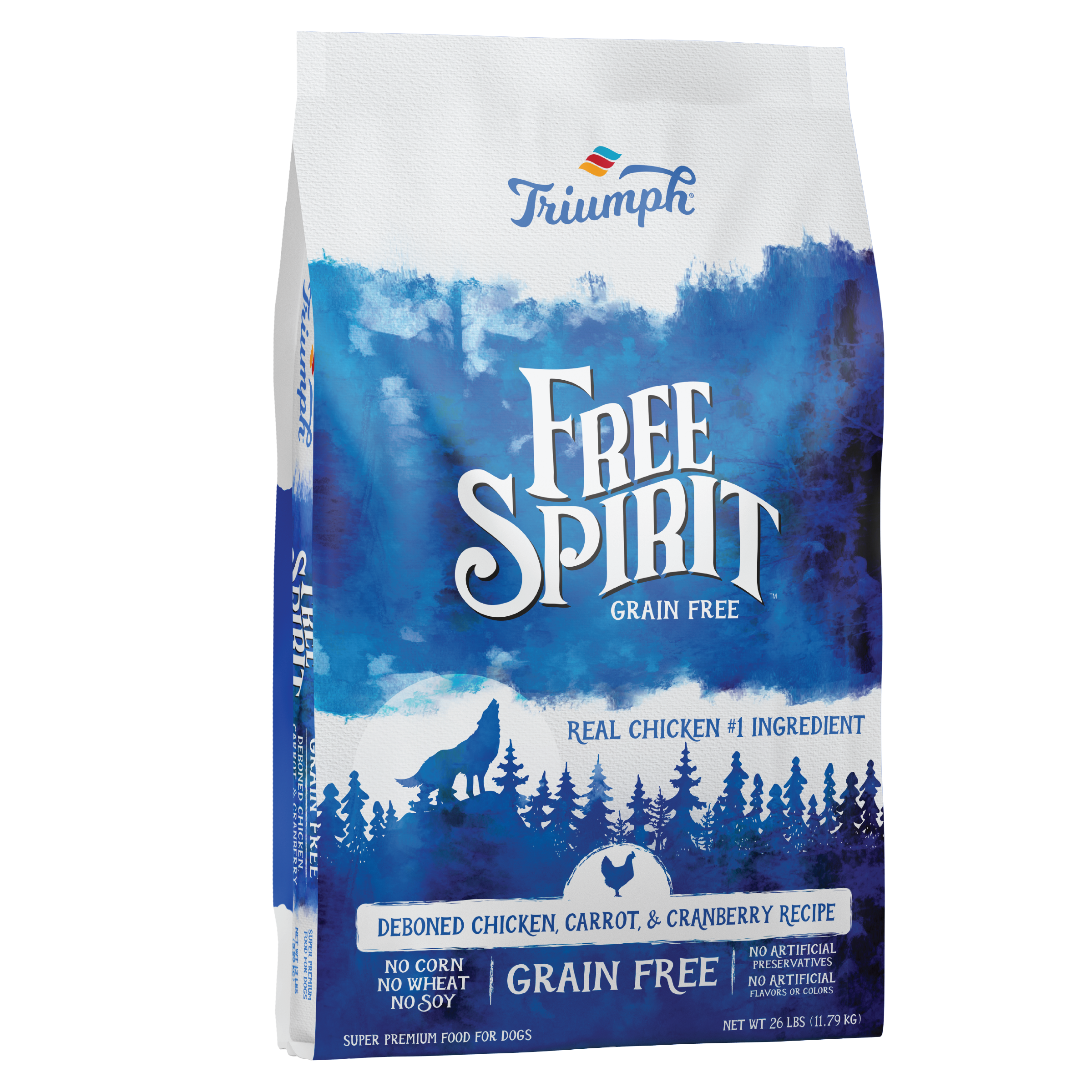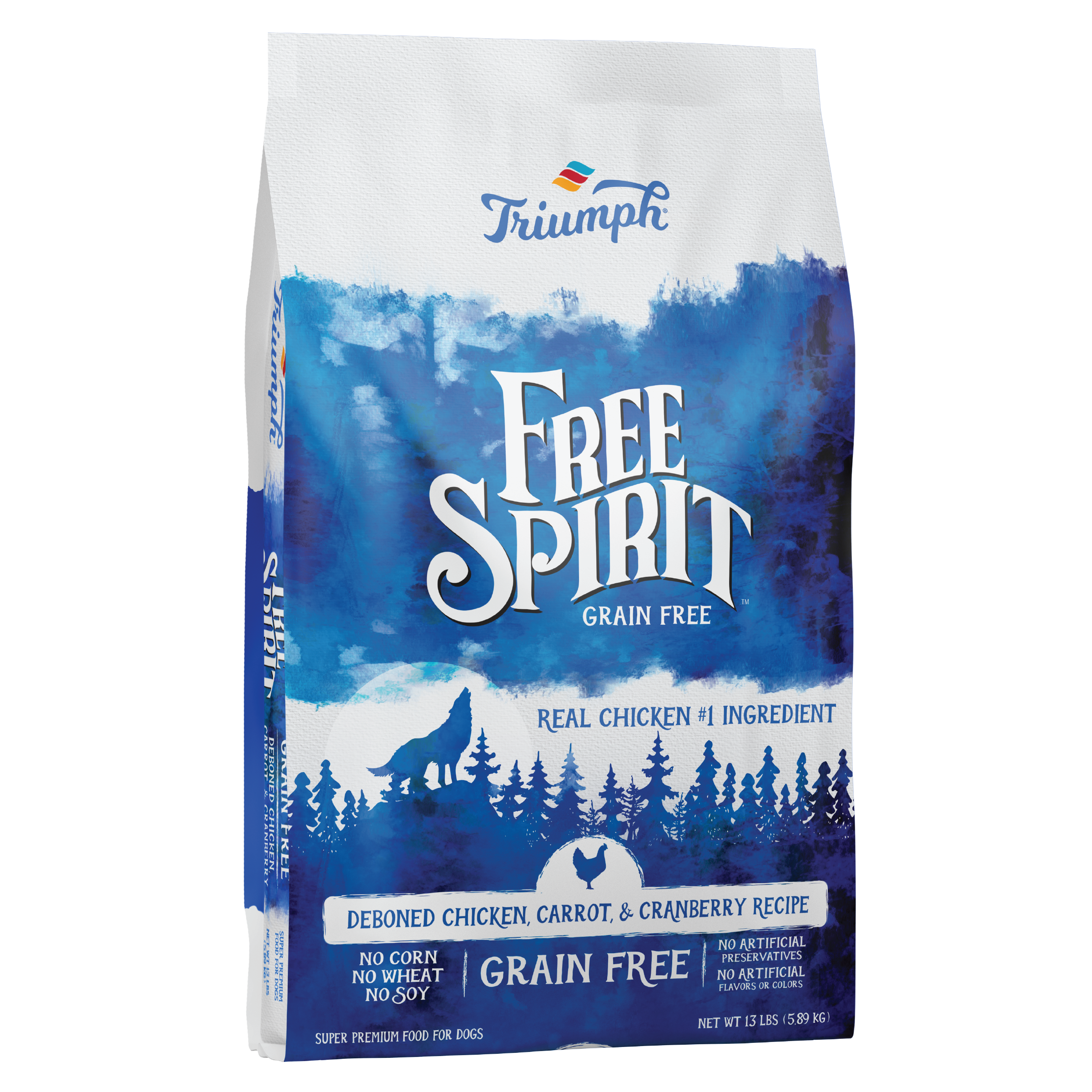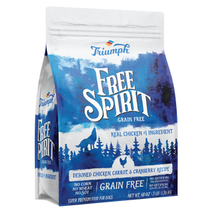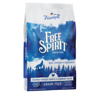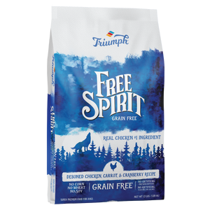 Triumph Free Spirit Grain Free formulas are crafted with nature's best ingredients, including easy to digest complex carbohydrates, which offer a healthy alternative to grains. Triumph Free Spirit Deboned Chicken, Carrot, & Cranberry Recipe starts with real chicken as the #1 ingredient, which appeals to your dog's natural ancestral instincts and true cravings. When combined with select vegetables, vitamins, and minerals, our Triumph Free Spirit Deboned Chicken, Carrot, & Cranberry Recipe delivers powerful nutrients and antioxidants that help support a healthy immune system, help maintain a healthy skin and coat, and help support overall good health. And best of all, your dog will naturally love it's great taste. Awaken your dog's Free Spirit!