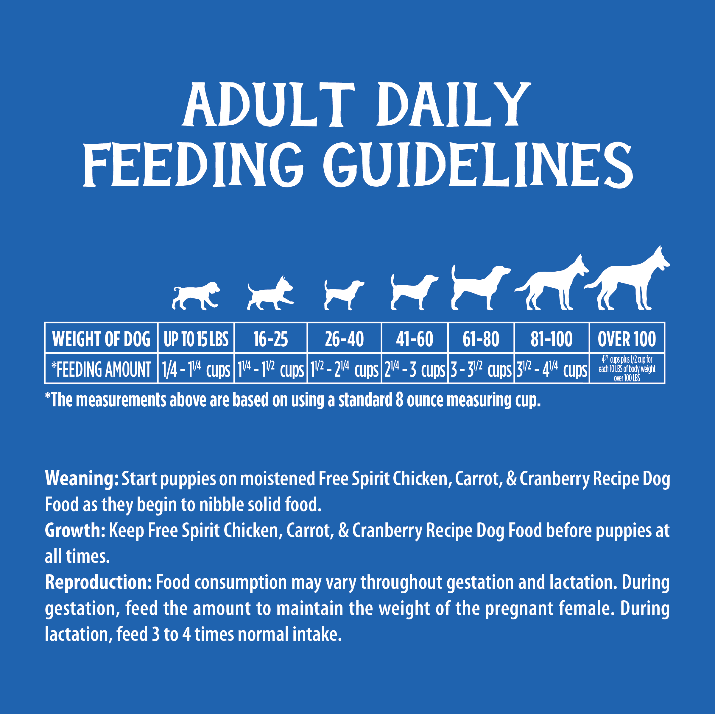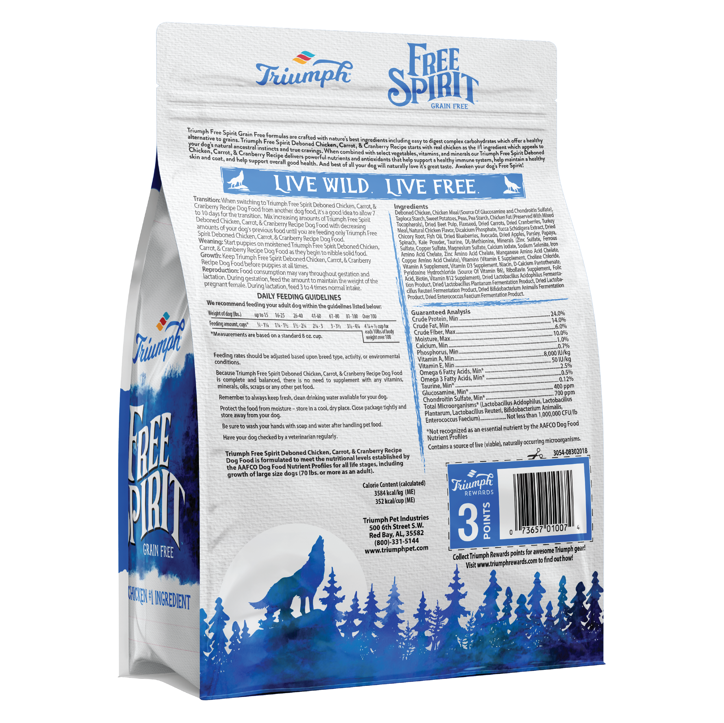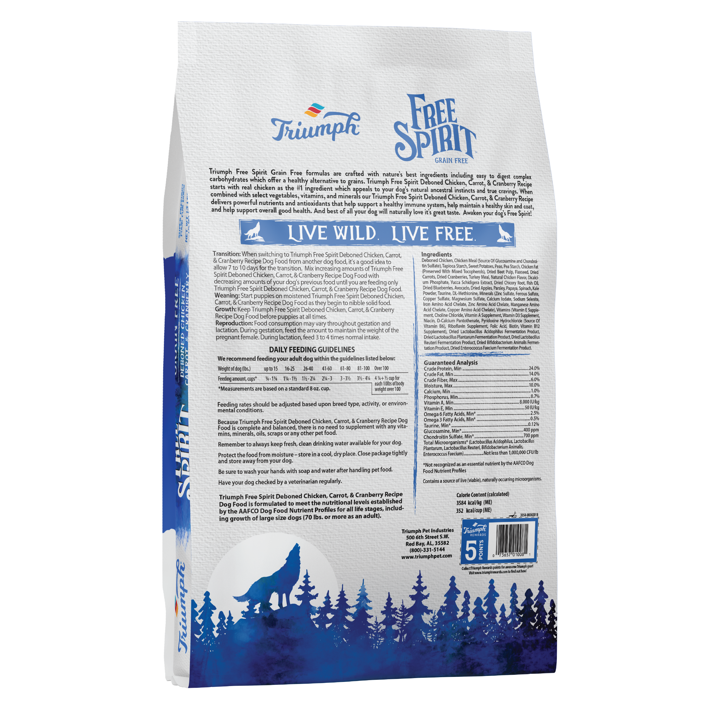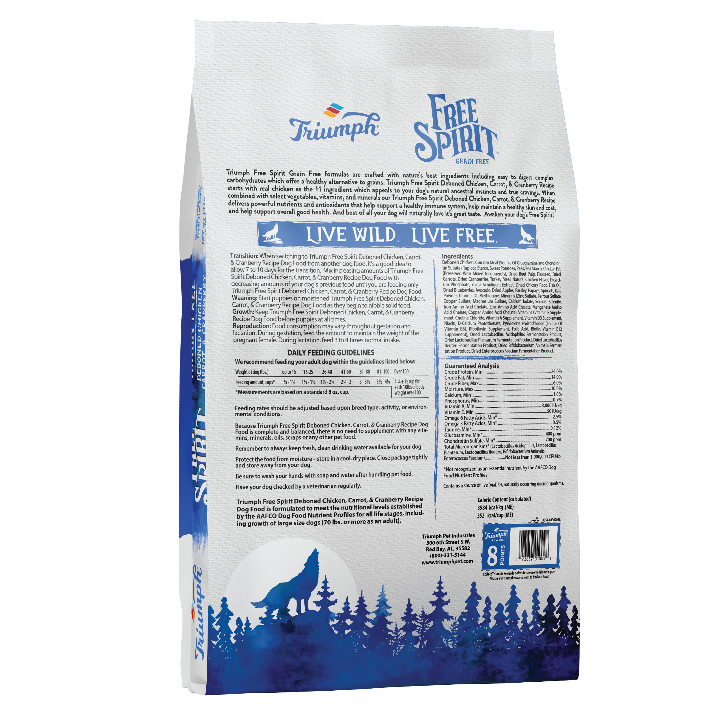 Triumph Free Spirit Deboned Chicken, Carrot, & Cranberry Recipe Dog Food is formulated to meet the nutritional levels established by the AAFCO Dog Food Nutrient Profiles for all life stages, including growth of large size dogs (70 lbs. or more as an adult).
