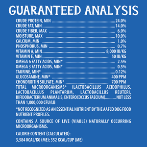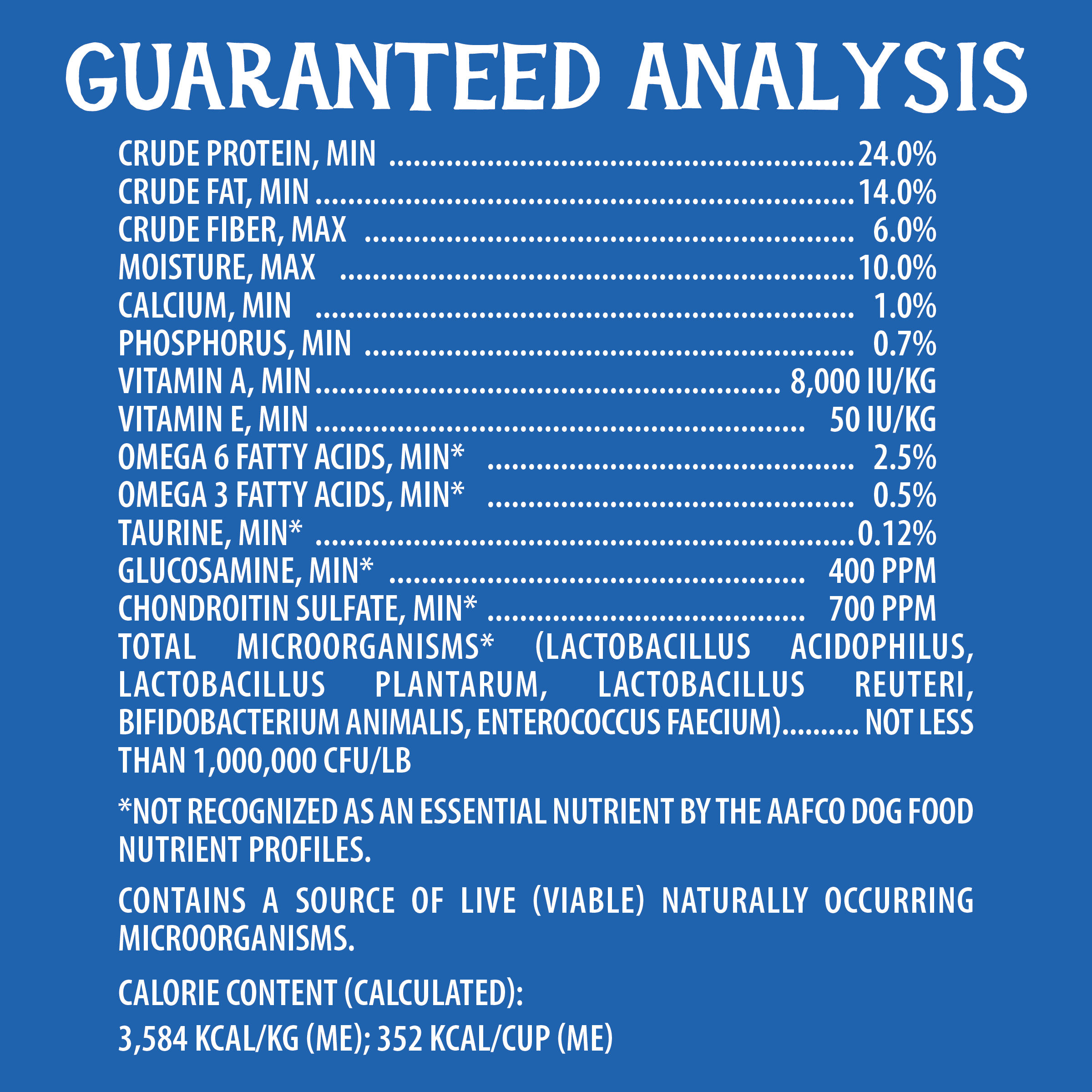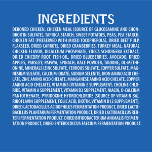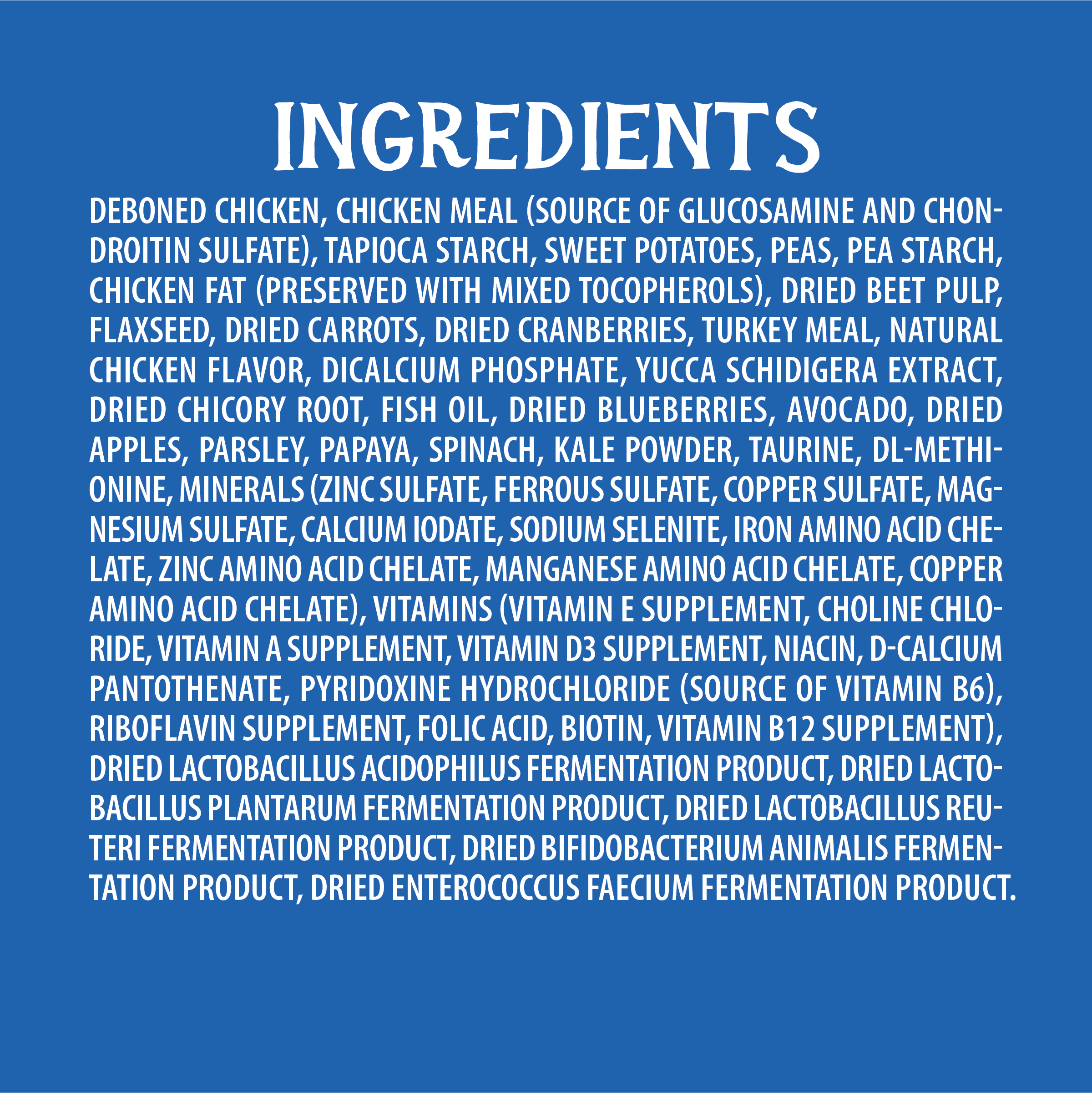 Deboned Chicken, Chicken Meal (Source Of Glucosamine and Chondroitin Sulfate), Tapioca Starch, Sweet Potatoes, Peas, Pea Starch, Chicken Fat (Preserved With Mixed Tocopherols), Dried Beet Pulp, Flaxseed, Dried Carrots, Dried Cranberries, Turkey Meal, Natural Chicken Flavor, Dicalcium Phosphate, Yucca Schidigera Extract, Dried Chicory Root, Fish Oil, Dried Blueberries, Avocado, Dried Apples, Parsley, Papaya, Spinach, Kale Powder, Taurine, DL-Methionine, Minerals (Zinc Sulfate, Ferrous Sulfate, Copper Sulfate, Magnesium Sulfate, Calcium Iodate, Sodium Selenite, Iron Amino Acid Chelate, Zinc Amino Acid Chelate, Manganese Amino Acid Chelate, Copper Amino Acid Chelate), Vitamins (Vitamin E Supplement, Choline Chloride, Vitamin A Supplement, Vitamin D3 Supplement, Niacin, D-Calcium Pantothenate, Pyridoxine Hydrochloride (Source Of Vitamin B6), Riboflavin Supplement, Folic Acid, Biotin, Vitamin B12 Supplement), Dried Lactobacillus Acidophilus Fermentation Product, Dried Lactobacillus Plantarum Fermentation Product, Dried Lactobacillus Reuteri Fermentation Product, Dried Bifidobacterium Animalis Fermentation Product, Dried Enterococcus Faecium Fermentation Product.Guaranteed Analysis