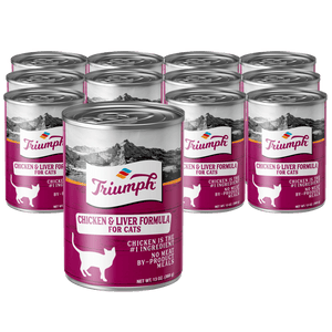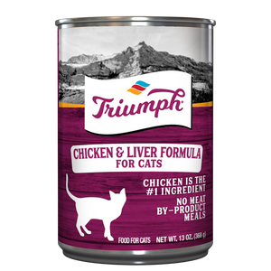 Triumph Cat Formulas consist of premium, naturally delicious ingredients, wholesome proteins, fats, and carbohydrates. Plus, they contain the premium flavor that cats love! Moreover, when feeding your cat Triumph Chicken and Liver Formula for Cats, it may be fed as a sole diet or mixed with dry food. This complete and balanced canned food is made for adult cats and contains added vitamins and minerals. The added vitamins and minerals help ensure that your cat is ingesting the essential nutrients needed to maintain a healthy, happy lifestyle. By choosing to feed your cat Triumph Chicken and Liver Formula Cat Food, you are choosing a bright future for your pet!
