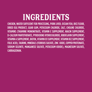 Chicken, Water Sufficient for Processing, Pork Liver, Ocean Fish, Rice Flour, Dried Egg Product, Guar Gum, Potassium Chloride, Salt, Minerals (Ferrous Sulfate, Zinc Oxide, Copper Proteinate, Manganous Sulfate, Potassium Iodide, Sodium Selenite), Vitamins (Vitamin E, A, D3, B12 Supplements, Thiamine Mononitrate, Niacin, D-Calcium Pantothenate, Pyridoxine Hydrochloride, Riboflavin Supplement, Folic Acid, Biotin), Choline Chloride, Carrageenan, Taurine.Guaranteed Analysis