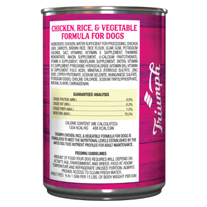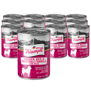 Triumph Dog Formulas consist of premium, naturally delicious ingredients, wholesome proteins, fats, and carbohydrates. Plus, they contain the premium flavor that dogs love! Moreover, when feeding your dog Triumph Chicken, Rice and Vegetable Formula for Dogs, it may be fed as a sole diet or mixed with dry food. This complete and balanced canned food is made for adult dogs and contains added vitamins and minerals. The added vitamins and minerals help ensure that your dog is ingesting the essential nutrients needed to maintain a healthy, happy lifestyle. By choosing to feed your dog Triumph Chicken, Rice and Vegetable Formula for Dogs, you are choosing a bright future for your pet!