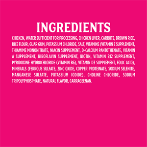 Chicken, Water Sufficient for Processing, Chicken Liver, Carrots, Brown Rice, Rice Flour, Guar Gum, Potassium Chloride, Salt, Minerals (Ferrous Sulfate, Zinc Oxide, Copper Proteinate, Manganous Sulfate, Potassium Iodide, Sodium Selenite), Vitamins (Vitamin E, A, B12, D3 Supplements, Thiamine Mononitrate, Biotin, Riboflavin Supplement), Choline Chloride, Sodium Tripolyphosphate, Natural Flavor, Carrageenan.Guaranteed Analysis