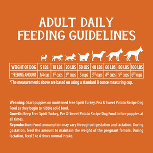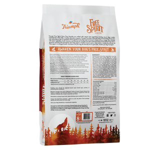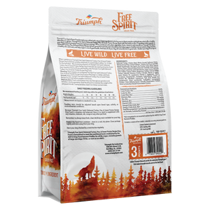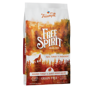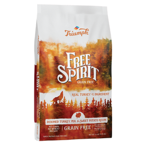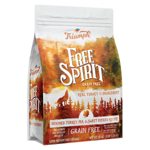 Triumph Free Spirit Grain Free formulas are crafted with nature's best ingredients including easy to digest complex carbohydrates which offer a healthy alternative to grains. Triumph Free Spirit Deboned Turkey, Pea, & Sweet Potato Recipe starts with real turkey as the #1 ingredient which appeals to your dog's natural ancestral instincts and true cravings. When combined with select vegetables, fruits, vitamins, and minerals our Triumph Free Spirit Deboned Turkey, Pea, & Sweet Potato Recipe delivers powerful nutrients and antioxidants that help support a healthy immune system, help maintain a healthy skin and coat, and help support overall good health. And best of all your dog will naturally love it's great taste. Awaken your dog's Free Spirit!