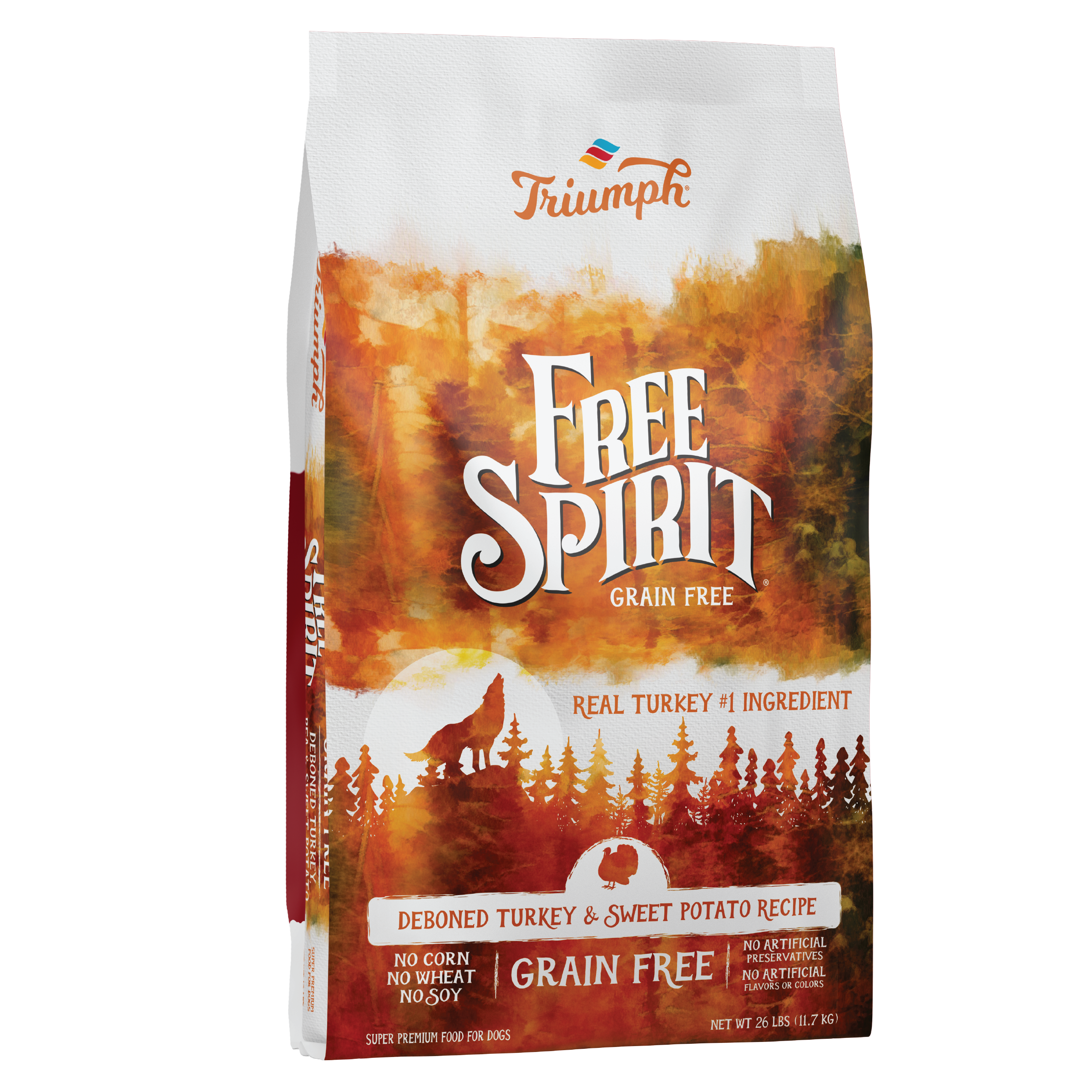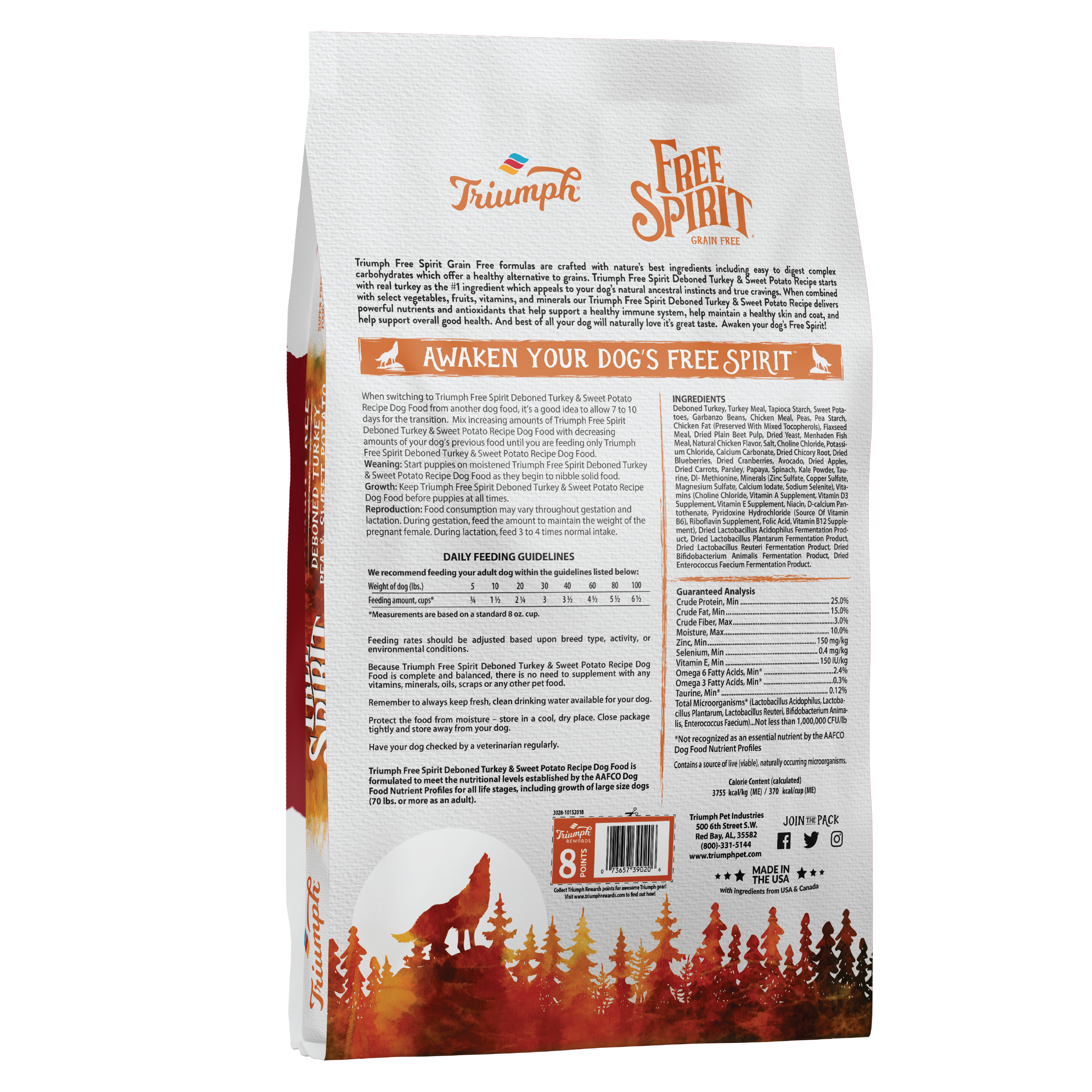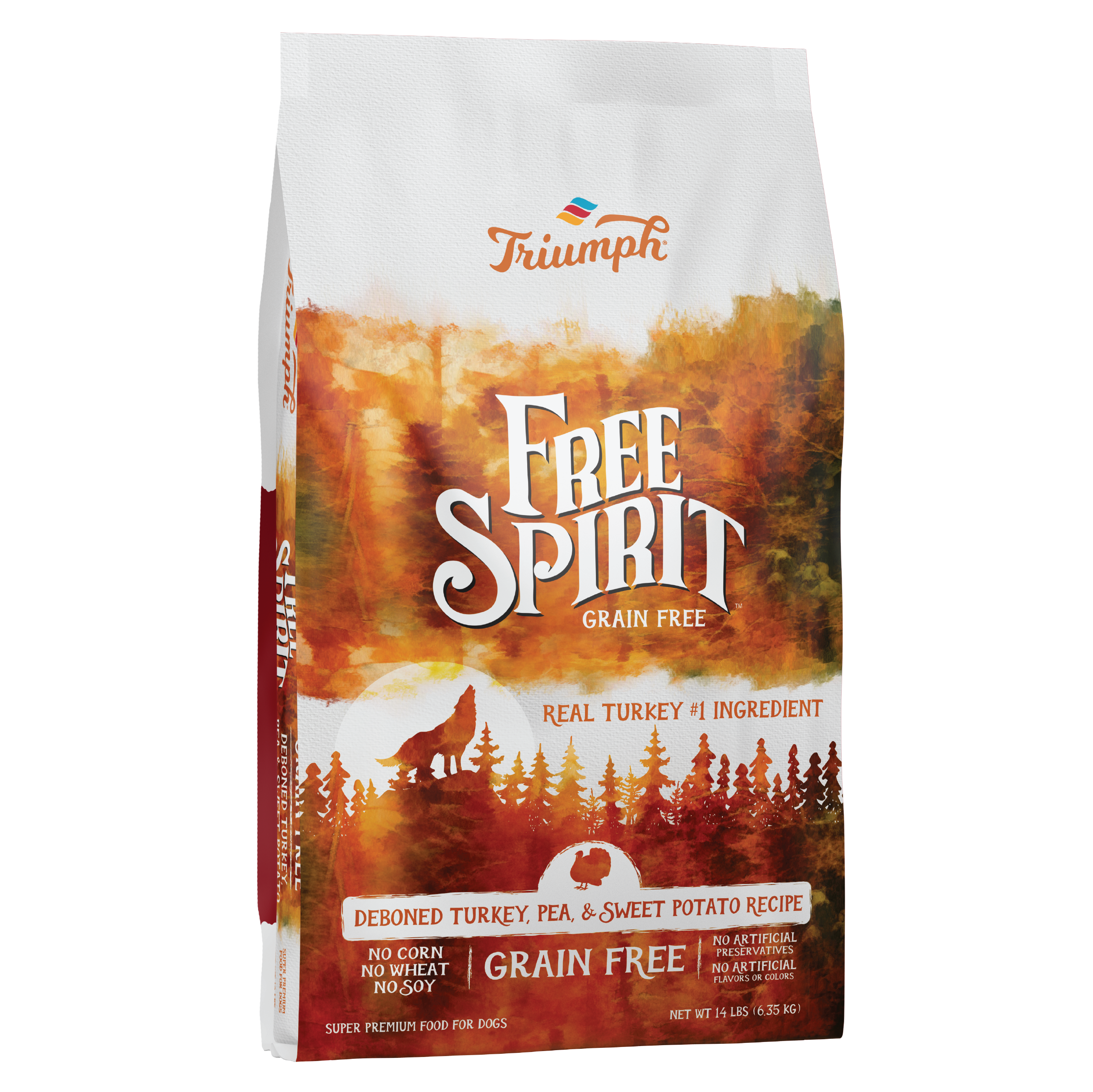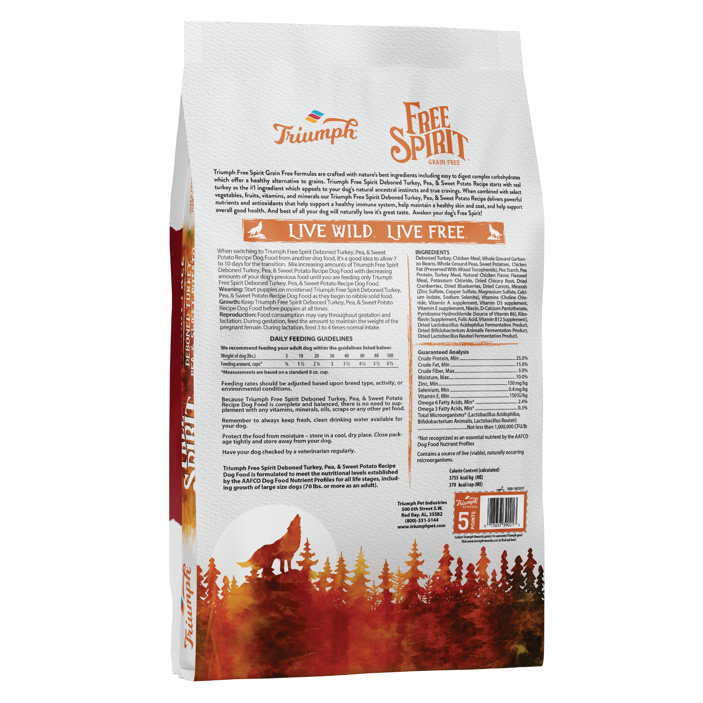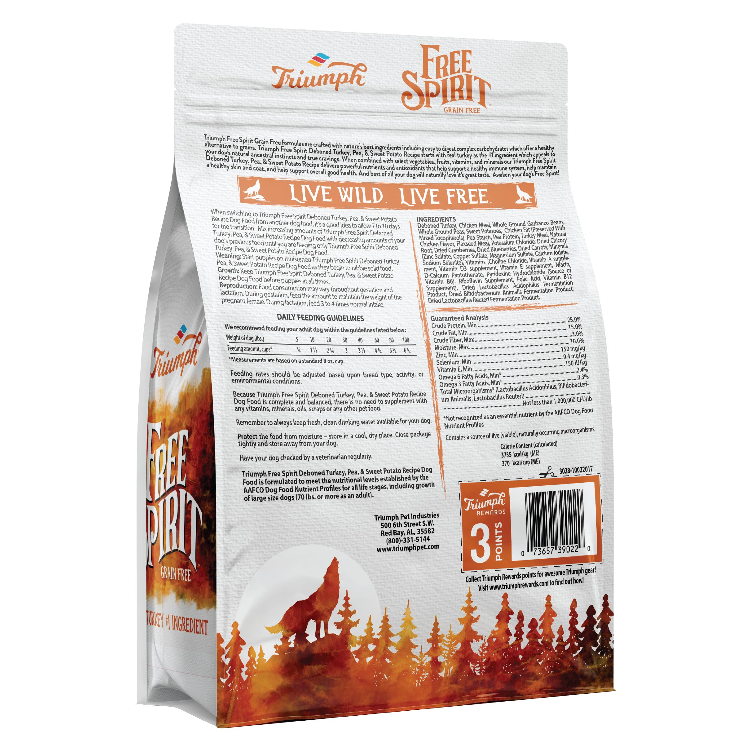 Triumph Free Spirit Grain Free Turkey, Pea and Sweet Potato Recipe Dog Food is formulated to meet the nutritional levels established by the AAFCO Dog Food Nutrient Profiles for all life stages, including growth of large size dogs (70 lbs. or more as an adult).