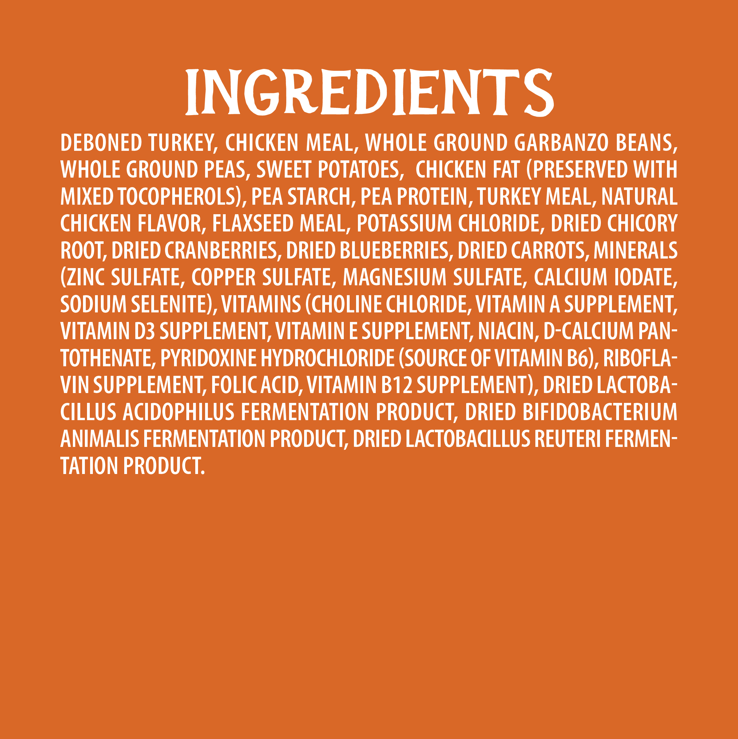 Deboned Turkey, Chicken Meal, Whole Ground Garbanzo Beans, Whole Ground Peas, Sweet Potatoes, Chicken Fat (Preserved With Mixed Tocopherols), Pea Starch, Pea Protein, Turkey Meal, Natural Chicken Flavor, Flaxseed Meal, Potassium Chloride, Dried Chicory Root, Dried Cranberries, Dried Blueberries, Dried Carrots, Minerals (Zinc Sulfate, Copper Sulfate, Magnesium Sulfate, Calcium Iodate, Sodium Selenite), Vitamins (Choline Chloride, Vitamin A supplement, Vitamin D3 supplement, Vitamin E supplement, Niacin, D-Calcium Pantothenate, Pyridoxine Hydrochloride (Source of Vitamin B6), Riboflavin Supplement, Folic Acid, Vitamin B12 Supplement), Dried Lactobacillus Acidophilus Fermentation Product, Dried Bidobacterium Animalis Fermentation Product, Dried Lactobacillus Reuteri Fermentation Product.Guaranteed Analysis