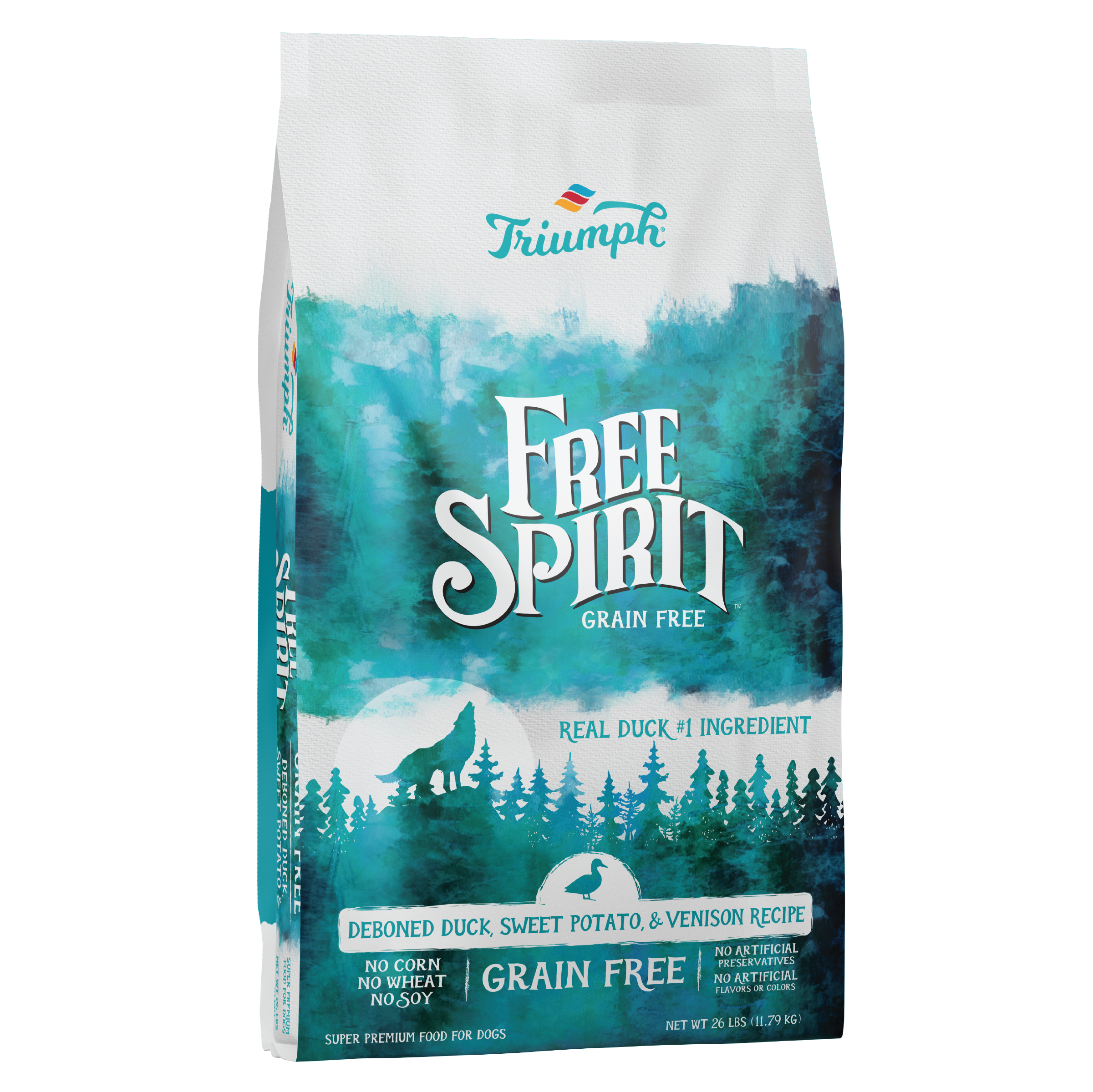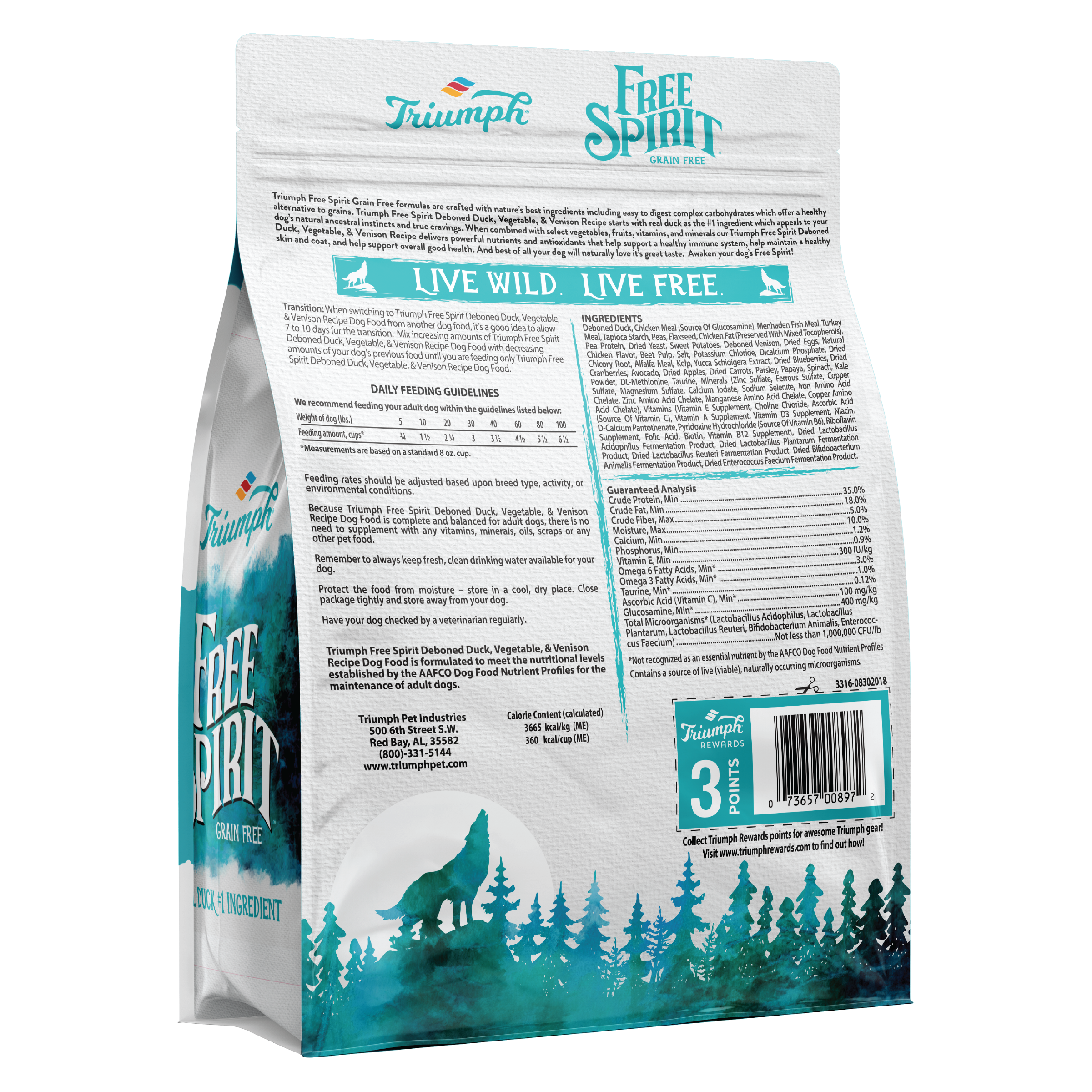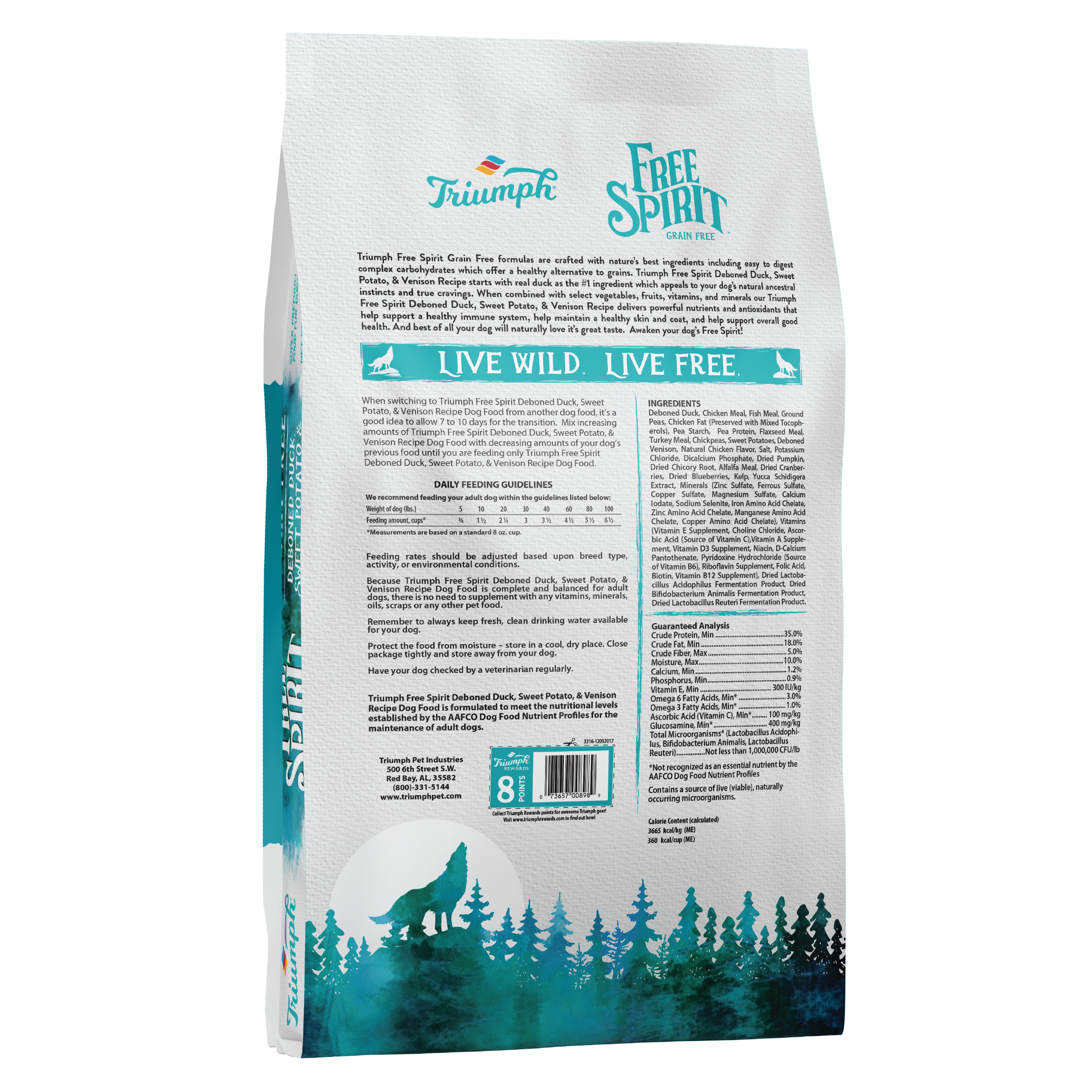 Triumph Free Spirit Grain Free Duck, Vegetable & Sweet Potato Recipe Dog Food is formulated to meet the nutritional levels established by the AAFCO Dog Food Nutrient Profiles for the maintenance of adult dogs.