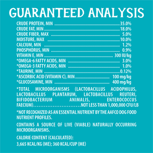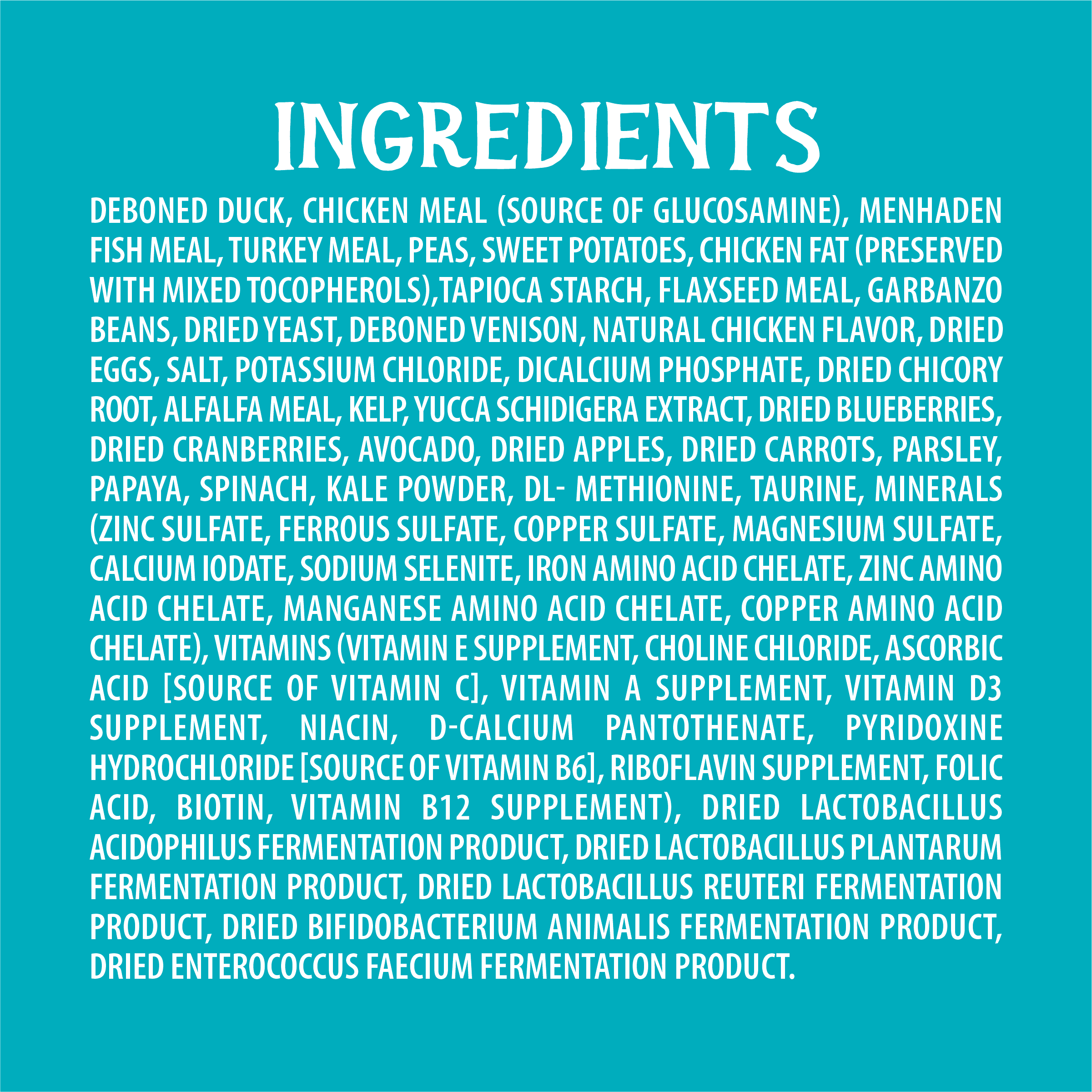 Deboned Duck, Chicken Meal (Source Of Glucosamine), Menhaden Fish Meal, Turkey Meal, Tapioca Starch, Peas, Flaxseed, Chicken Fat (Preserved With Mixed Tocopherols), Pea Protein, Dried Yeast, Sweet Potatoes, Deboned Venison, Dried Eggs, Natural Chicken Flavor, Beet Pulp, Salt, Potassium Chloride, Dicalcium Phosphate, Dried Chicory Root, Alfalfa Meal, Kelp, Yucca Schidigera Extract, Dried Blueberries, Dried Cranberries, Avocado, Dried Apples, Dried Carrots, Parsley, Papaya, Spinach, Kale Powder, DL-Methionine, Taurine, Minerals (Zinc Sulfate, Ferrous Sulfate, Copper Sulfate, Magnesium Sulfate, Calcium Iodate, Sodium Selenite, Iron Amino Acid Chelate, Zinc Amino Acid Chelate, Manganese Amino Acid Chelate, Copper Amino Acid Chelate), Vitamins (Vitamin E Supplement, Choline Chloride, Ascorbic Acid (Source Of Vitamin C), Vitamin A Supplement, Vitamin D3 Supplement, Niacin, D-Calcium Pantothenate, Pyridoxine Hydrochloride (Source Of Vitamin B6), Riboflavin Supplement, Folic Acid, Biotin, Vitamin B12 Supplement), Dried Lactobacillus Acidophilus Fermentation Product, Dried Lactobacillus Plantarum Fermentation Product, Dried Lactobacillus Reuteri Fermentation Product, Dried Bifidobacterium Animalis Fermentation Product, Dried Enterococcus Faecium Fermentation Product..Guaranteed Analysis