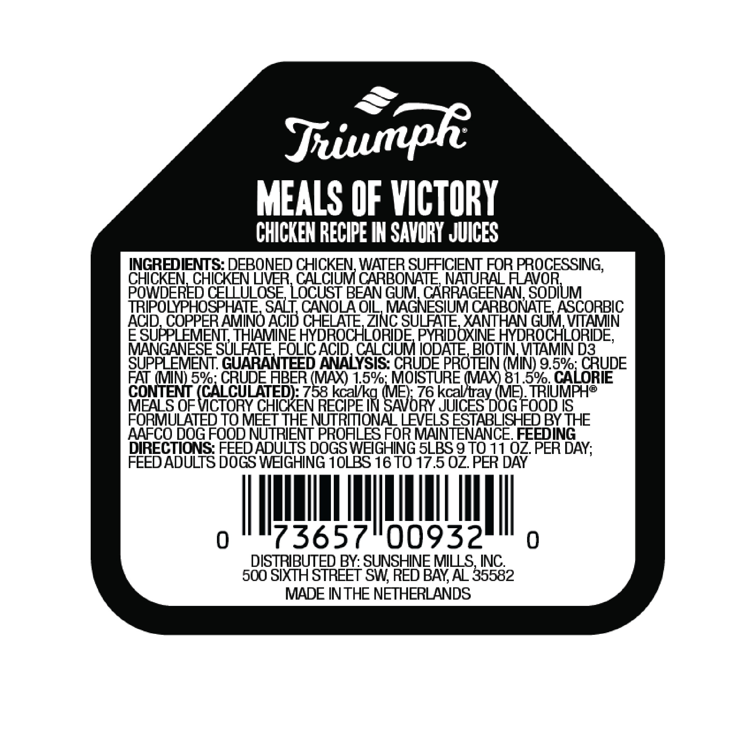 Triumph Meals of Victory Chicken Recipe Dog Food is formulated to meet the nutritional levels established by the AAFCO Dog Food Nutrient Profiles for maintenance.