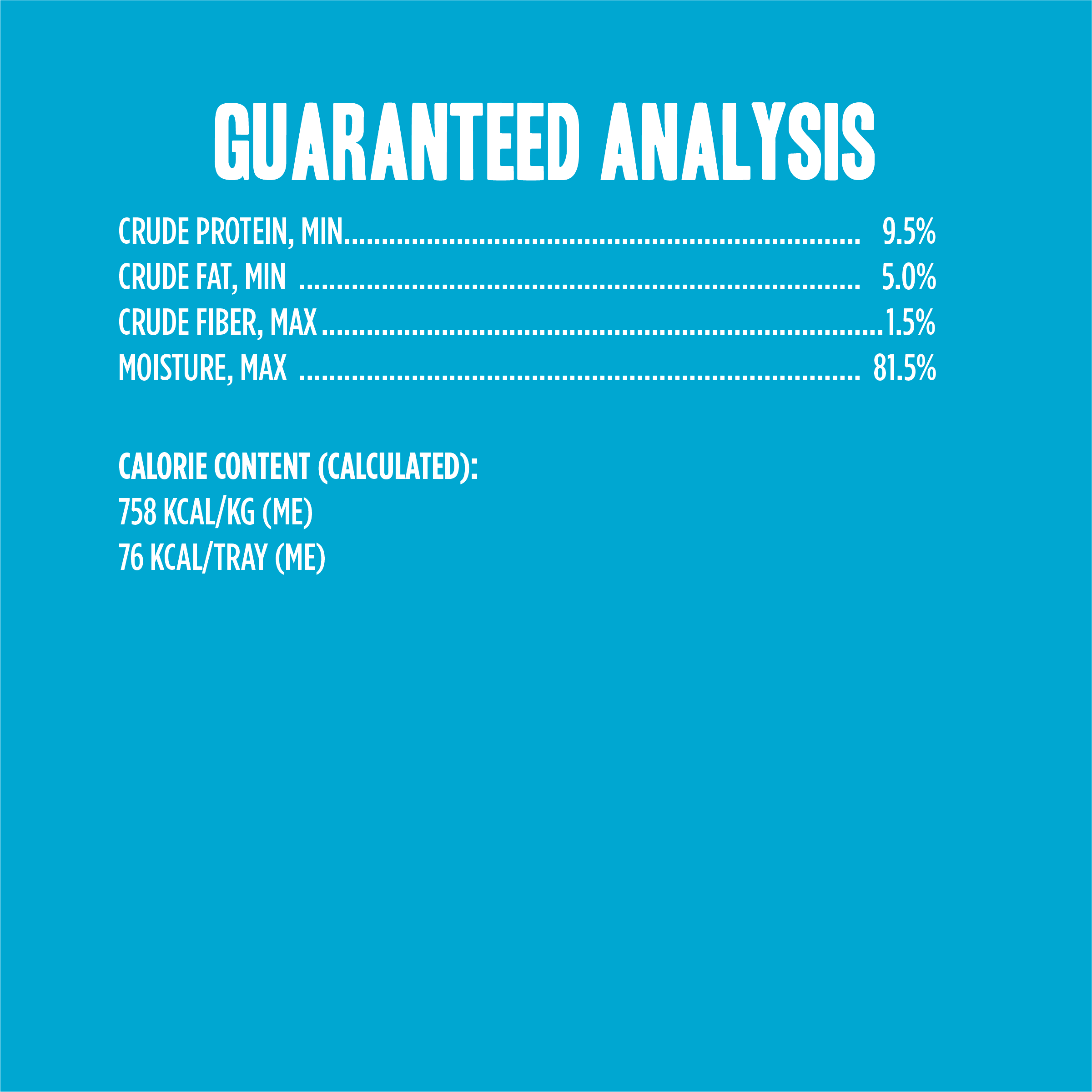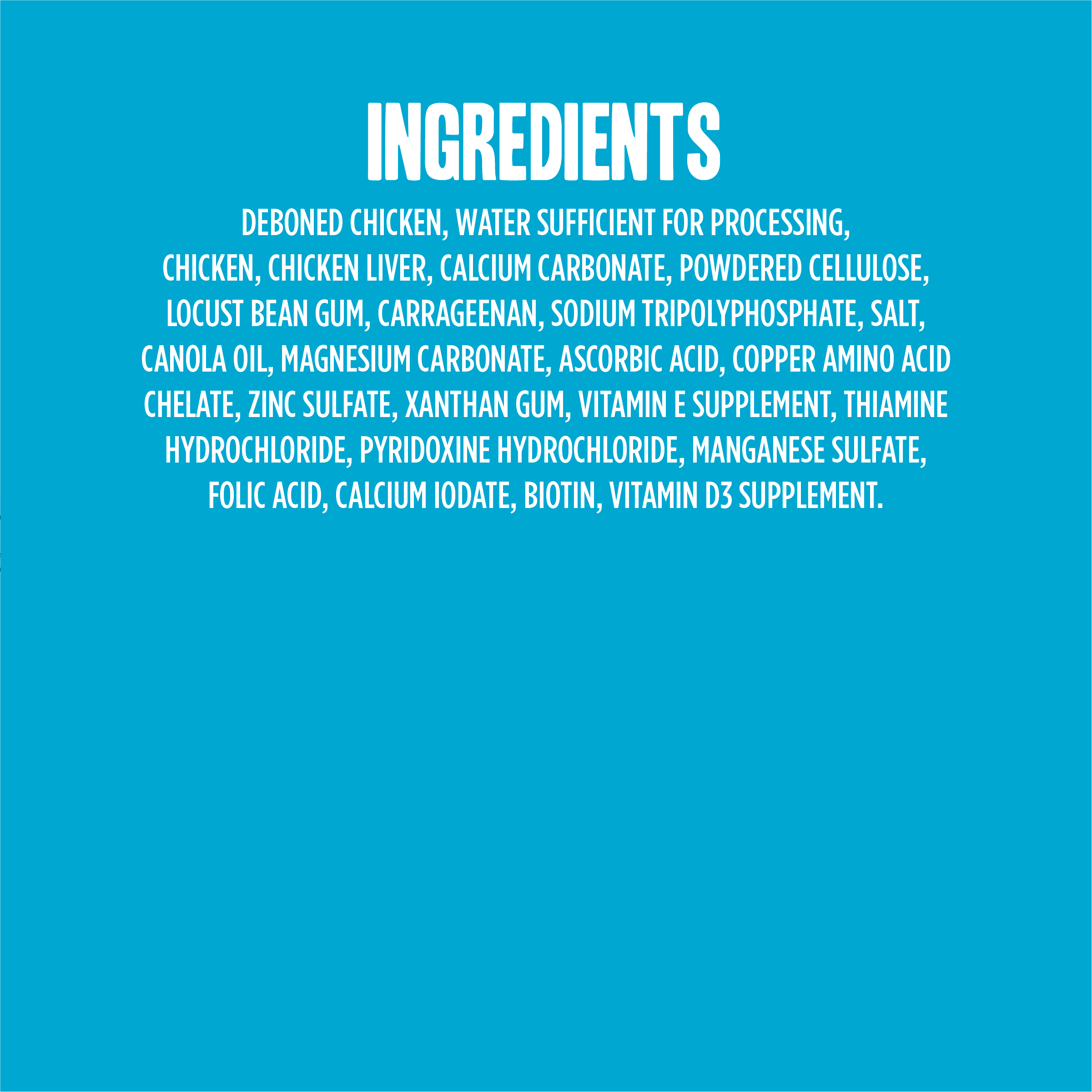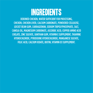 Deboned Chicken, Water Sufficient For Processing, Chicken, Chicken Liver, Calcium Carbonate, Powdered Cellulose, Locust Bean Gum, Carrageenan, Sodium Tripolyphosphate, Salt, Canola Oil, Magnesium Carbonate, Ascorbic Acid, Copper Amino AcidChelate, Zinc Sulfate, Xanthan Gum, Vitamin E Supplement, Thiamine Hydrochloride, Pyridoxine Hydrochloride, Manganese Sulfate, Folic Acid, Calcium Iodate, Biotin, Vitamin D3 Supplement.Guaranteed Analysis