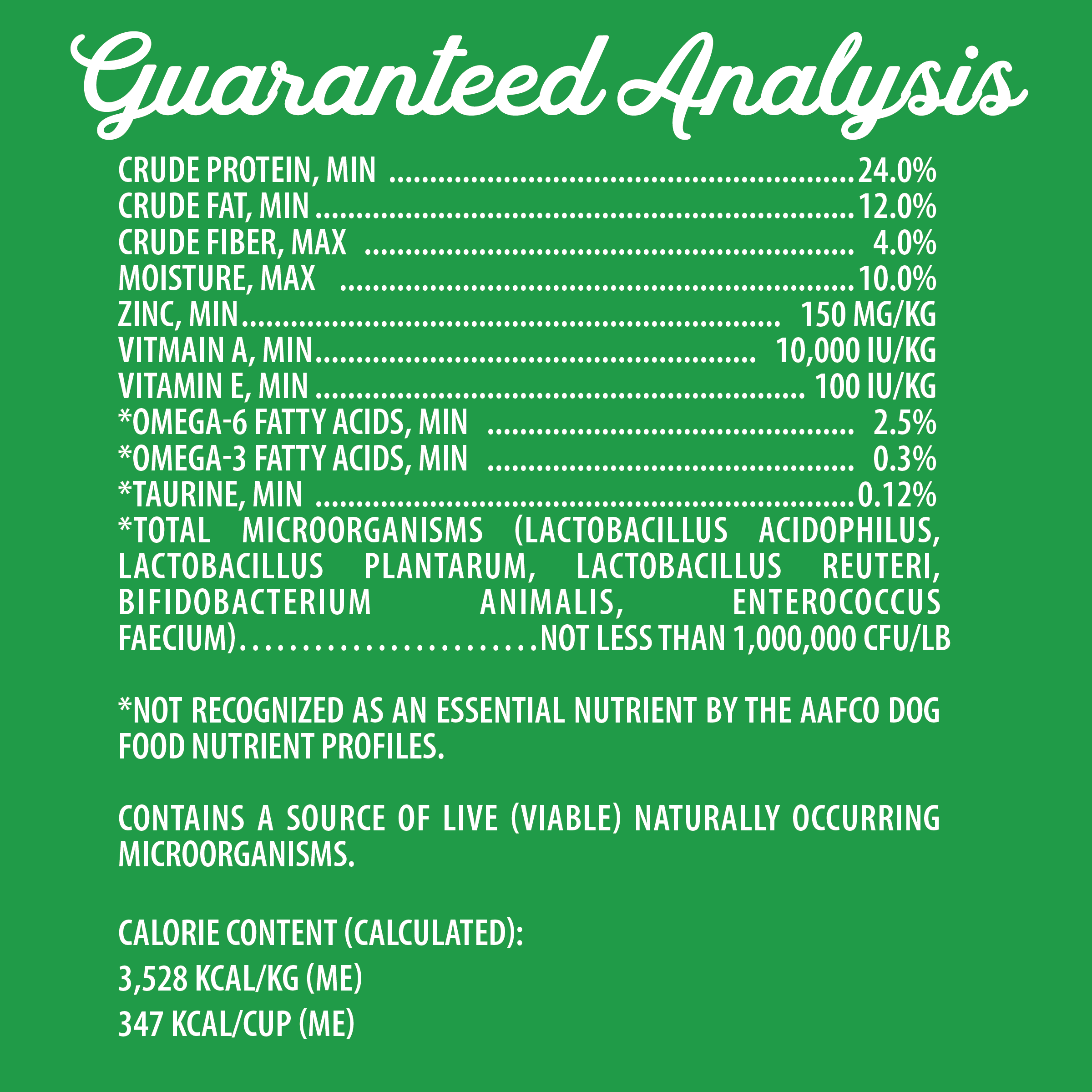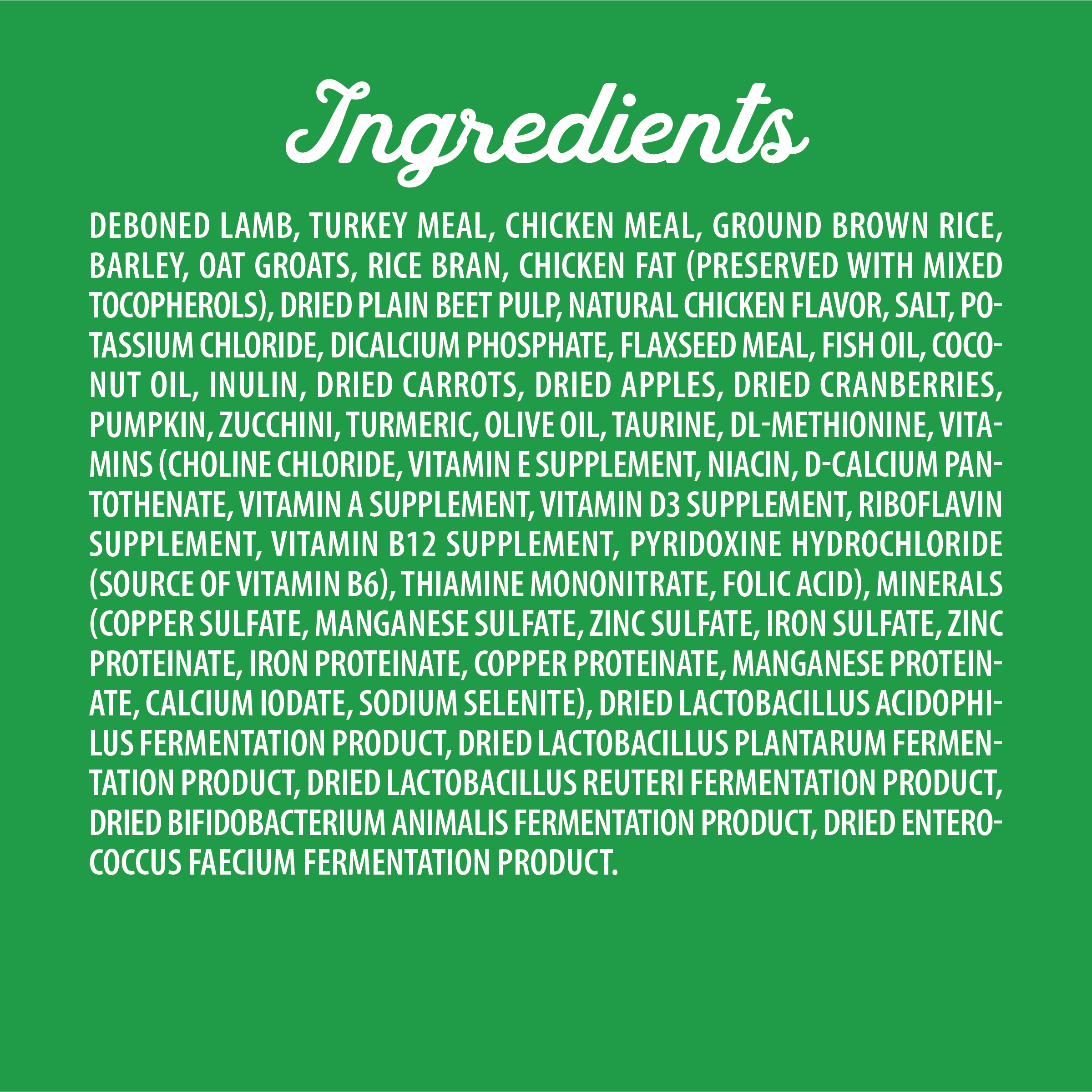 Deboned Lamb, Turkey Meal, Chicken Meal, Ground Brown Rice, Barley, Oat Groats, Rice Bran, Chicken Fat (Preserved With Mixed Tocopherols), Dried Plain Beet Pulp, Natural Chicken Flavor, Salt, Potassium Chloride, Dicalcium Phosphate, Flaxseed Meal, Fish Oil, Coconut Oil, Inulin, Dried Carrots, Dried Apples, Dried Cranberries, Pumpkin, Zucchini, Turmeric, Olive Oil, Taurine, Dl-Methionine, Vitamins (Choline Chloride, Vitamin E Supplement, Niacin, D-Calcium Pantothenate, Vitamin A Supplement, Vitamin D3 Supplement, Riboflavin Supplement, Vitamin B12 Supplement, Pyridoxine Hydrochloride (Source Of Vitamin B6), Thiamine Mononitrate, Folic Acid), Minerals (Copper Sulfate, Manganese Sulfate, Zinc Sulfate, Iron Sulfate, Zinc Proteinate, Iron Proteinate, Copper Proteinate, Manganese Proteinate, Calcium Iodate, Sodium Selenite), Dried Lactobacillus Acidophilus Fermentation Product, Dried Lactobacillus Plantarum Fermentation Product, Dried Lactobacillus Reuteri Fermentation Product, Dried Bifidobacterium Animalis Fermentation Product, Dried Enterococcus Faecium Fermentation Product.Guaranteed Analysis