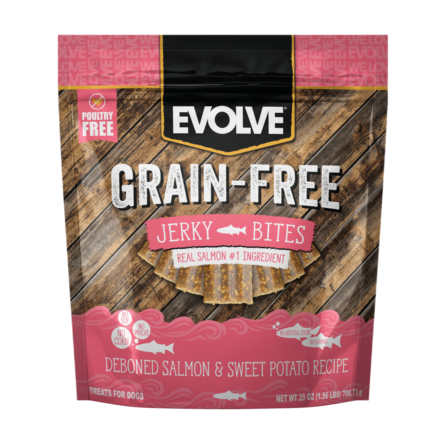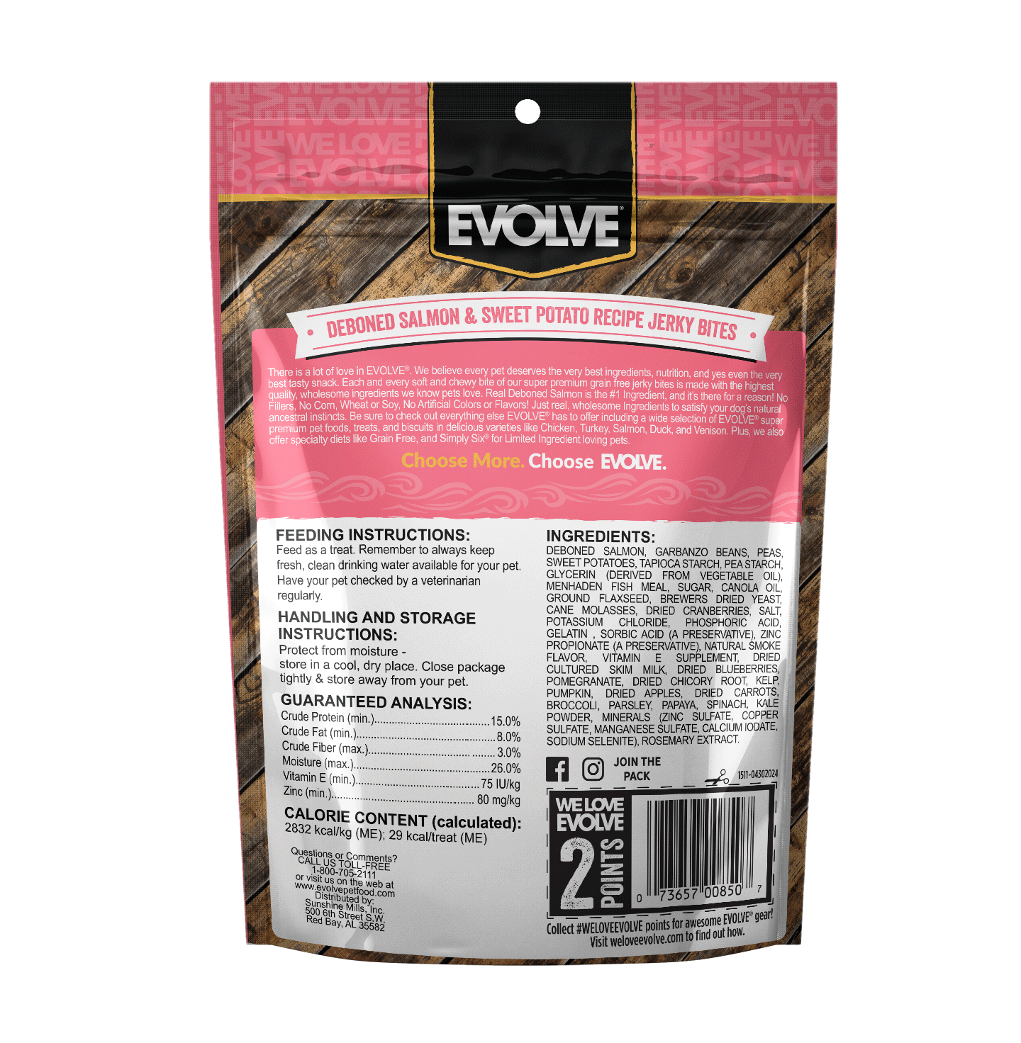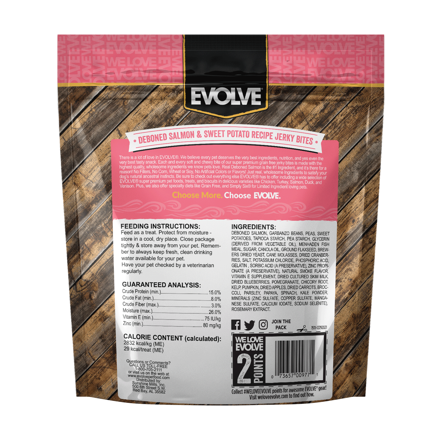 Evolve Grain Free Salmon & Sweet Potato Recipe Jerky Bites are healthy and holistic treats designed for dogs with food sensitivities, which in turn helps promote a healthy immune system. The treats are soft and moist, which will entice your best friend to continuously want more. The advanced grain-free formula combined with the Salmon and Sweet Potato ingredients not only taste great to your best friend, but are a nutritious snack to help keep your dog happy and healthy. Choosing Evolve Grain Free Salmon & Sweet Potato Recipe Jerky Bites is the key to a healthy and holistic future for your best friend!