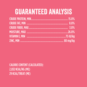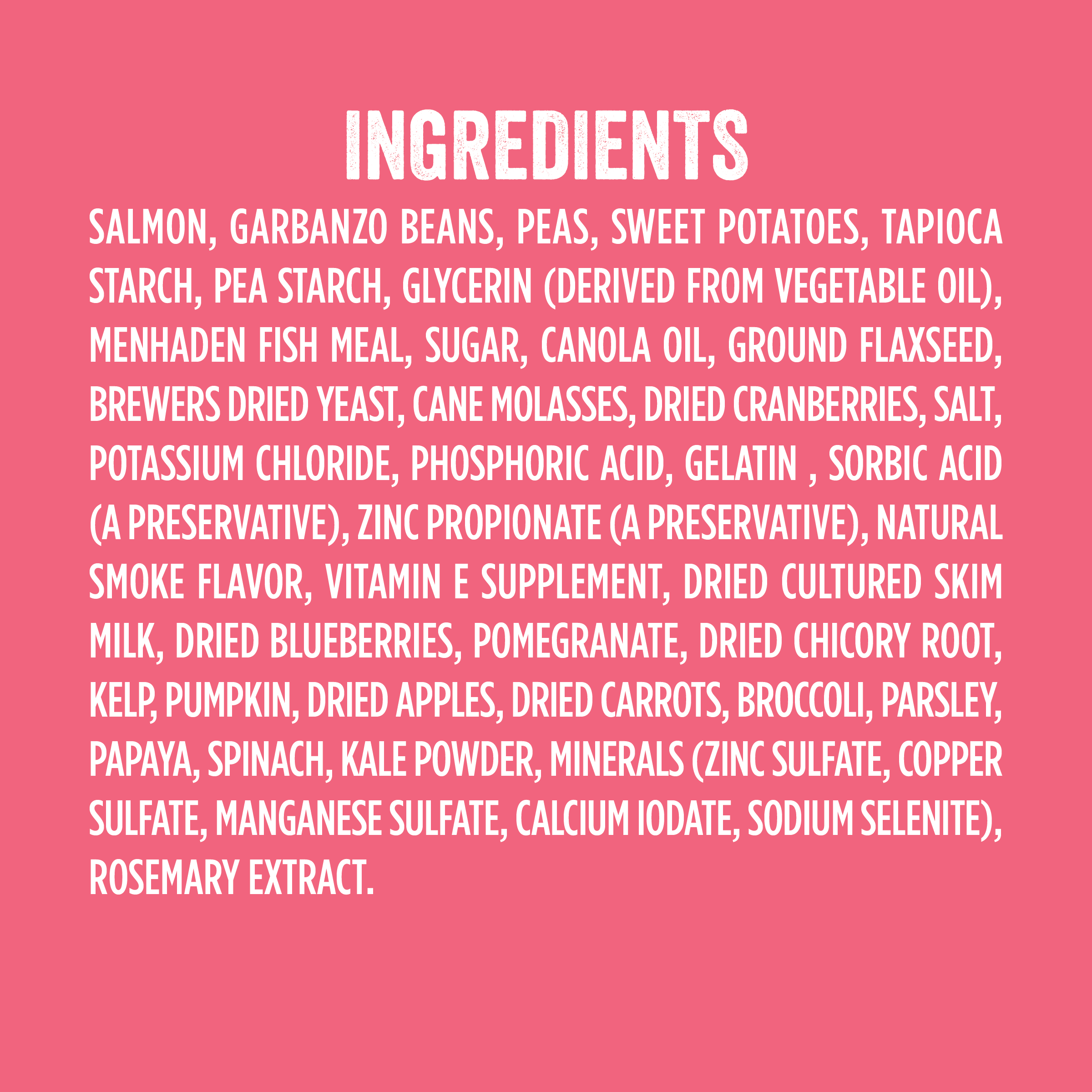 SALMON, GARBANZO BEANS, PEAS, SWEET POTATOES, TAPIOCA STARCH, PEA STARCH, GLYCERIN (DERIVED FROM VEGETABLE OIL), MENHADEN FISH MEAL, SUGAR, CANOLA OIL, GROUND FLAXSEED, BREWERS DRIED YEAST, CANE MOLASSES, DRIED CRANBERRIES, SALT, POTASSIUM CHLORIDE, PHOSPHORIC ACID, GELATIN , SORBIC ACID (A PRESERVATIVE), ZINC PROPIONATE (A PRESERVATIVE), NATURAL SMOKE FLAVOR, VITAMIN E SUPPLEMENT, DRIED CULTURED SKIM MILK, DRIED BLUEBERRIES, POMEGRANATE, DRIED CHICORY ROOT, KELP, PUMPKIN, DRIED APPLES, DRIED CARROTS, BROCCOLI, PARSLEY, PAPAYA, SPINACH, KALE POWDER, MINERALS (ZINC SULFATE, COPPER SULFATE, MANGANESE SULFATE, CALCIUM IODATE, SODIUM SELENITE), ROSEMARY EXTRACT.Guaranteed Analysis