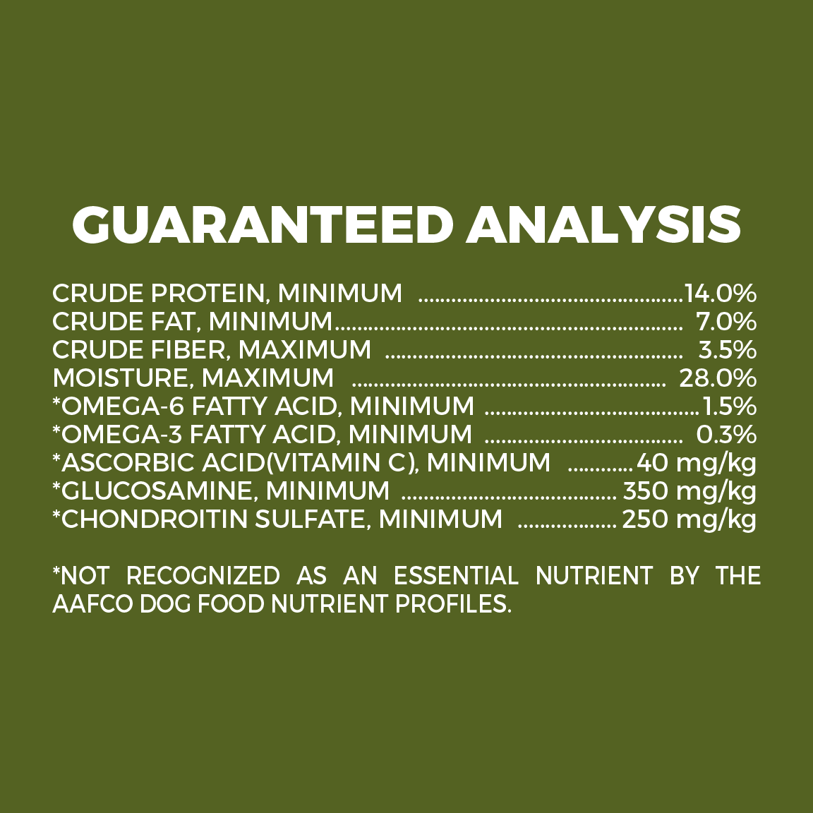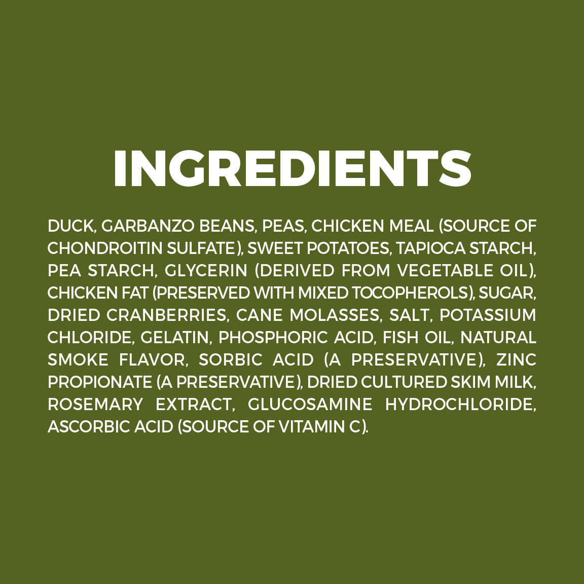 Duck, Garbanzo Beans, Peas, Chicken Meal (Source of Chondroitin Sulfate), Sweet Potatoes, Tapioca Starch, Pea Starch, Glycerin (Derived from Vegetable Oil), Chicken Fat (Preserved with Mixed Tocopherols), Sugar, Dried Cranberries, Cane Molasses, Salt, Potassium Chloride, Gelatin, Phosphoric Acid, Fish Oil, Natural Smoke Flavor, Sorbic Acid (A Preservative), Zinc Propionate (A Preservative), Dried Cultured Skim Milk, Rosemary Extract, Glucosamine Hydrochloride, Ascorbic Acid (Source of Vitamin C).Guaranteed Analysis
