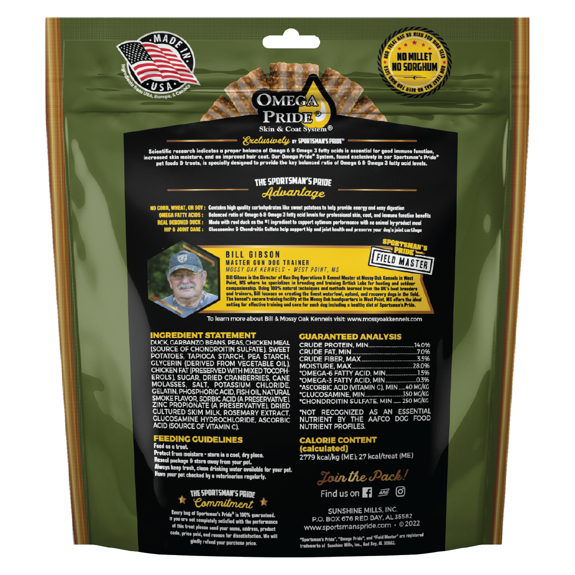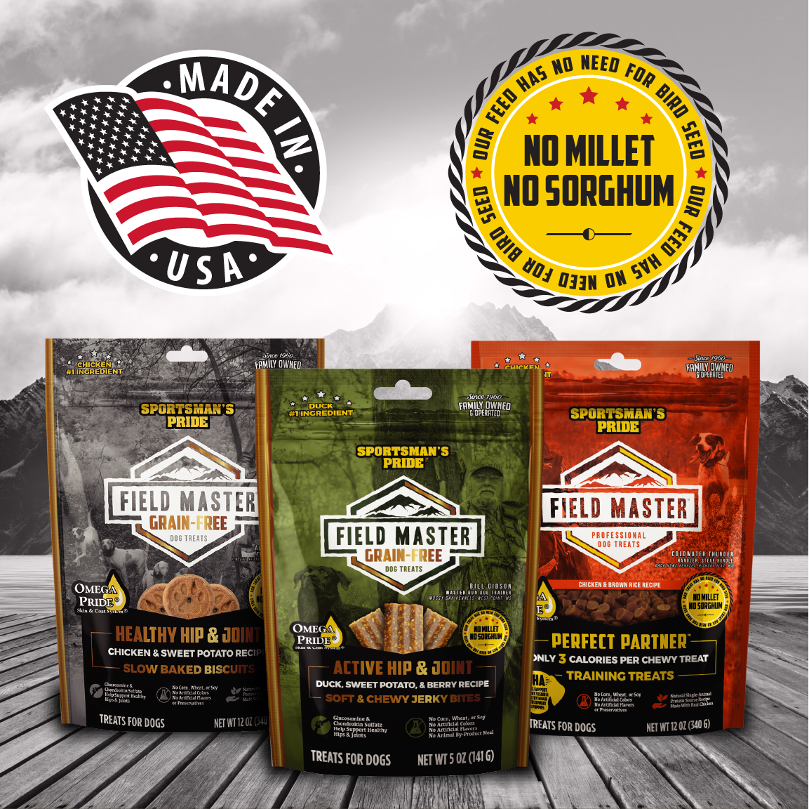 Sportsman's Pride Field Master Grain Free Dog Treats are the go-to training & rewarding tools trusted by legends. True masters of their craft. For dogs with food sensitivities, our natural Grain Free formulas are a great choice. Optimized for performance, these treats start with the main protein as the #1 ingredient. Every formula is crafted by experts for optimum rewarding and dependability right here in the USA. Natural Dog Treats with No Corn, Wheat, Soy, Millet, or Sorghum & the best ingredients in the field. Made with our exclusive Omega Pride Skin & Coat System because a proper balance of Omega fatty acids is essential for good immune function, increased skin moisture, and an improved hair coat. Outstanding performance for any champion and a healthy, happy dog.