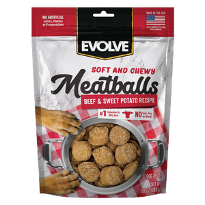 Evolve Beef & Sweet Potato Meatballs are delicious bite-size treats that are loaded with real meat that your dog craves. Our recipe features a special slow cooking process that makes each morsel soft in texture and taste incredible. Real Beef is the #1 Ingredient, and it's there for a reason! No Fillers, No Corn, Wheat or Soy, No Artificial Colors, Flavors, or Preservatives! Just real, wholesome Ingredients to satisfy your dog's natural ancestral instincts. We're proud to make all of our Evolve Meatballs in the U.S.A. in our family owned and operated kitchens.