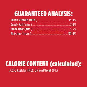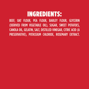 Beef, Oat Flour, Pea Flour, Barley Flour, Glycerin (Derived from Vegetable Oil), Sugar, Sweet Potatoes, Canola Oil, Gelatin, Salt, Distilled Vinegar, Citric Acid (A Preservative), Potassium Chloride, Rosemary Extract.Guaranteed Analysis