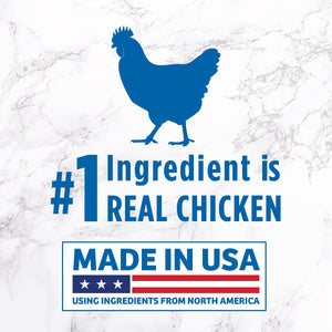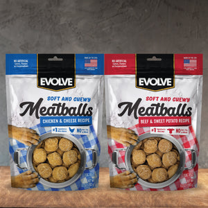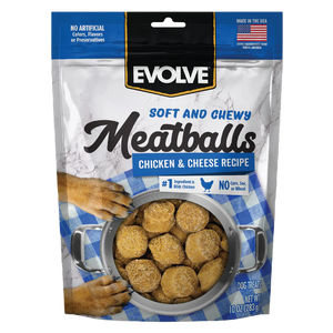 Evolve Chicken & Cheese Meatballs are delicious bite-size treats that are loaded with real meat that your dog craves. Our recipe features a special slow cooking process that makes each morsel soft in texture and taste incredible. Real Chicken is the #1 Ingredient, and it's there for a reason! No Fillers, No Corn, Wheat or Soy, No Artificial Colors, Flavors, or Preservatives! Just real, wholesome Ingredients to satisfy your dog's natural ancestral instincts. We're proud to make all of our Evolve Meatballs in the U.S.A. in our family owned and operated kitchens.