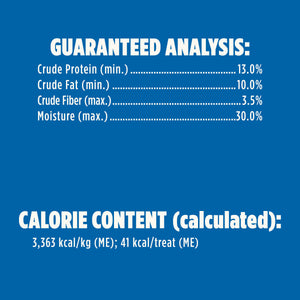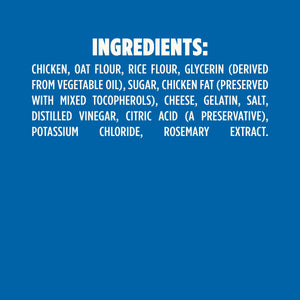 Chicken, Oat Flour, Rice Flour, Glycerin (Derived From Vegetable Oil), Sugar, Chicken Fat (Preserved with Mixed Tocopherols), Cheese, Gelatin, Salt, Distilled Vinegar, Citric Acid (A Preservative), Potassium Chloride, Rosemary Extract.Guaranteed Analysis