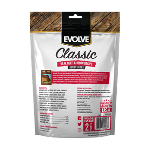 Evolve Classic Beef & Bison Recipe Jerky Bites Dog Treats are delicious bite-size treats that are loaded with real USA sourced beef and bison meat that your dog craves. Our recipe is Poultry Free and features a special slow cooking process that makes each morsel soft in texture and taste incredible. Real USA Sourced Beef is the #1 Ingredient, and it's there for a reason! No Fillers, No Corn, Wheat or Soy, No Artificial Colors or Flavors! Just real, wholesome Ingredients to satisfy your dog's natural ancestral instincts. We're proud to make all of our Evolve Classic Jerky Bites bites in the U.S.A. in our family owned and operated kitchens.