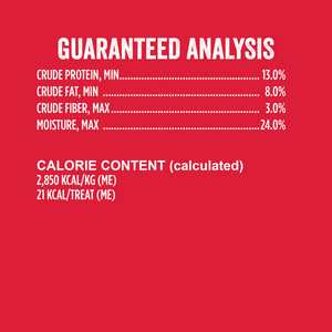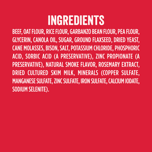 BEEF, OAT FLOUR, RICE FLOUR, GARBANZO BEAN FLOUR, PEA FLOUR, GLYCERIN, CANOLA OIL, SUGAR, GROUND FLAXSEED, DRIED YEAST, CANE MOLASSES, BISON, SALT, POTASSIUM CHLORIDE, PHOSPHORIC ACID, SORBIC ACID (A PRESERVATIVE), ZINC PROPIONATE (A PRESERVATIVE), NATURAL SMOKE FLAVOR, ROSEMARY EXTRACT, DRIED CULTURED SKIM MILK, MINERALS (COPPER SULFATE, MANGANESE SULFATE, ZINC SULFATE, IRON SULFATE, CALCIUM IODATE, SODIUM SELENITE). Guaranteed Analysis