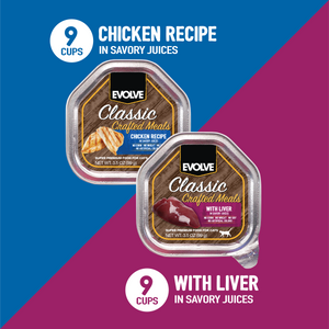 Evolve Classic Crafted Meals Chicken Recipe and with Liver Cat Food is made with select wholesome ingredients and slowly cooked to mouthwatering perfection! Great as a stand alone meal for smaller furry friends, or a dry food topper that will get those paws begging for dinner time! Your best friend will love the taste, quality, and nutrition that comes with this classic craft of a meal.