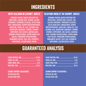 Classic Crafted Meals Seafood Medley in Savory JuicesDeboned Chicken, Water Sufficient for Processing, Chicken Liver, Pollock, Cod, Calcium Carbonate, Powdered Cellulose, Locust Bean Gum, Carrageenan, Sodium Tripolyphosphate, Guar Gum, Canola Oil, Salt, Ascorbic Acid, Magnesium Carbonate, Taurine, Vitamin E Supplement, Zinc Sulfate, Xanthan Gum, Thiamine Hydrochloride, Copper Amino Acid Chelate, Pyridoxine Hydrochloride, Manganese Sulfate, Folic Acid, Vitamin D3 Supplement, Calcium Iodate, Biotin.