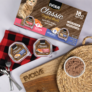 Evolve Classic Crafted Meals Salmon Recipe and Seafood Medley Cat Food is made with select wholesome ingredients and slowly cooked to mouthwatering perfection! Great as a stand alone meal for smaller furry friends, or a dry food topper that will get those paws begging for dinner time! Your best friend will love the taste, quality, and nutrition that comes with this classic craft of a meal.