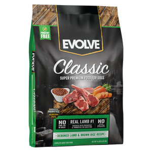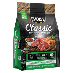 Evolve Classic Deboned Lamb & Brown Rice Recipe Dog Food has all the nutrition needed for a happy and healthy life. This nutrient-rich premium food contains high-quality proteins, complex carbohydrates, vegetables, minerals, vitamins oils and fats. Because we care about the quality of our dog food, we chose to make real lamb the number 1 ingredient, which appeals to your dog's natural ancestral instincts and cravings. We want nature's best ingredients for your best friend! Therefore, you can feel confident feeding your dog this superior, wholesome food with a naturally delicious flavor!