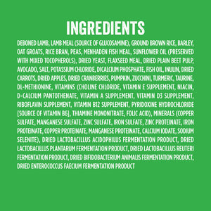 DEBONED LAMB, LAMB MEAL (SOURCE OF GLUCOSAMINE), GROUND BROWN RICE, BARLEY, OAT GROATS, RICE BRAN, PEAS, MENHADEN FISH MEAL, SUNFLOWER OIL (PRESERVED WITH MIXED TOCOPHEROLS), DRIED YEAST, FLAXSEED MEAL, DRIED PLAIN BEET PULP, AVOCADO, SALT, POTASSIUM CHLORIDE, DICALCIUM PHOSPHATE, FISH OIL, INULIN, DRIED CARROTS, DRIED APPLES, DRIED CRANBERRIES, PUMPKIN, ZUCCHINI, TURMERIC, TAURINE, DL-METHIONINE, VITAMINS (CHOLINE CHLORIDE, VITAMIN E SUPPLEMENT, NIACIN, D-CALCIUM PANTOTHENATE, VITAMIN A SUPPLEMENT, VITAMIN D3 SUPPLEMENT, RIBOFLAVIN SUPPLEMENT, VITAMIN B12 SUPPLEMENT, PYRIDOXINE HYDROCHLORIDE [SOURCE OF VITAMIN B6], THIAMINE MONONITRATE, FOLIC ACID), MINERALS (COPPER SULFATE, MANGANESE SULFATE, ZINC SULFATE, IRON SULFATE, ZINC PROTEINATE, IRON PROTEINATE, COPPER PROTEINATE, MANGANESE PROTEINATE, CALCIUM IODATE, SODIUM SELENITE), DRIED LACTOBACILLUS ACIDOPHILUS FERMENTATION PRODUCT, DRIED LACTOBACILLUS PLANTARUM FERMENTATION PRODUCT, DRIED LACTOBACILLUS REUTERI FERMENTATION PRODUCT, DRIED BIFIDOBACTERIUM ANIMALIS FERMENTATION PRODUCT, DRIED ENTEROCOCCUS FAECIUM FERMENTATION PRODUCTGuaranteed Analysis