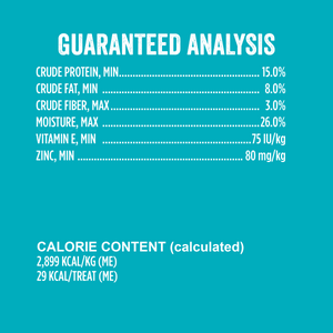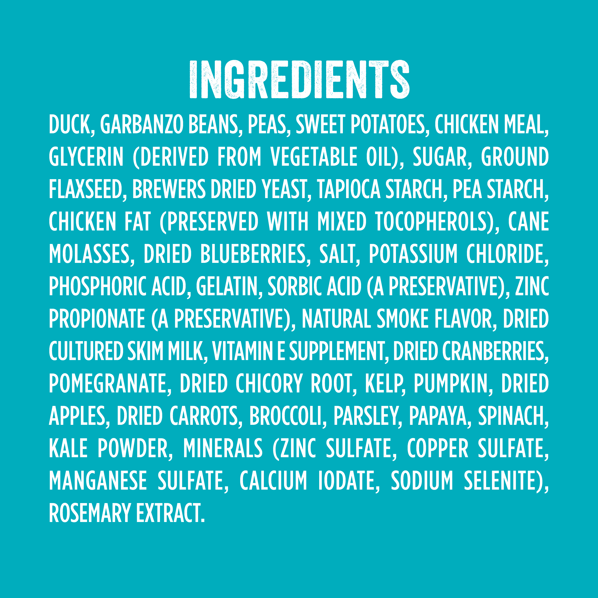 DUCK, GARBANZO BEANS, PEAS, SWEET POTATOES, CHICKEN MEAL,  GLYCERIN (DERIVED FROM VEGETABLE OIL), SUGAR, GROUND FLAXSEED, BREWERS DRIED YEAST, TAPIOCA STARCH, PEA STARCH, CHICKEN FAT (PRESERVED WITH MIXED TOCOPHEROLS), CANE MOLASSES, DRIED BLUEBERRIES, SALT, POTASSIUM CHLORIDE, PHOSPHORIC ACID, GELATIN, SORBIC ACID (A PRESERVATIVE), ZINC PROPIONATE (A PRESERVATIVE), NATURAL SMOKE FLAVOR, DRIED CULTURED SKIM MILK, VITAMIN E SUPPLEMENT, DRIED CRANBERRIES, POMEGRANATE, DRIED CHICORY ROOT, KELP, PUMPKIN, DRIED APPLES, DRIED CARROTS, BROCCOLI, PARSLEY, PAPAYA, SPINACH, KALE POWDER, MINERALS (ZINC SULFATE, COPPER SULFATE, MANGANESE SULFATE, CALCIUM IODATE, SODIUM SELENITE), ROSEMARY EXTRACT.Guaranteed Analysis
