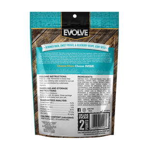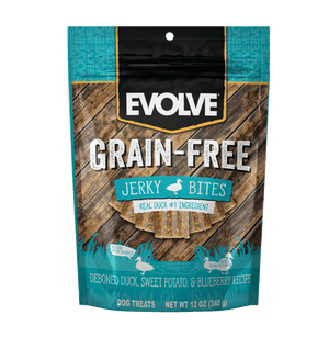 Evolve Grain Free Duck, Sweet Potato & Blueberry Recipe Jerky Bites are healthy and holistic treats designed for dogs with food sensitivities, which in turn helps promote a healthy immune system. The treats are soft and moist, which will entice your best friend to continuously want more. The advanced grain-free formula combined with the Duck and Blueberry ingredients not only taste great to your best friend, but are a nutritious snack to help keep your dog happy and healthy. Choosing Evolve Grain Free Duck, Sweet Potato & Blueberry Recipe Jerky Bites is the key to a healthy and holistic future for your best friend!Β