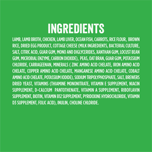 LAMB, LAMB BROTH, CHICKEN, LAMB LIVER, OCEAN FISH, CARROTS, RICE FLOUR, BROWN RICE, DRIED EGG PRODUCT, COTTAGE CHEESE (MILK INGREDIENTS, BACTERIAL CULTURE, SALT, CITRIC ACID, GUAR GUM, MONO AND DIGLYCERIDES, XANTHAN GUM, LOCUST BEAN GUM, MICROBIAL ENZYME, CARBON DIOXIDE), PEAS, OAT BRAN, GUAR GUM, POTASSIUM CHLORIDE, CARRAGEENAN, MINERALS (ZINC AMINO ACID CHELATE, IRON AMINO ACID CHELATE, COPPER AMINO ACID CHELATE, MANGANESE AMINO ACID CHELATE, COBALT AMINO ACID CHELATE, POTASSIUM IODIDE), SODIUM TRIPOLYPHOSPHATE, SALT, BREWERS DRIED YEAST, VITAMINS (THIAMINE MONONITRATE, VITAMIN E SUPPLEMENT, NIACIN SUPPLEMENT, D-CALCIUM PANTOTHENATE, VITAMIN A SUPPLEMENT, RIBOFLAVIN SUPPLEMENT, BIOTIN, VITAMIN B12 SUPPLEMENT, PYRIDOXINE HYDROCHLORIDE, VITAMIN D3 SUPPLEMENT, FOLIC ACID), INULIN, CHOLINE CHLORIDE.Guaranteed Analysis