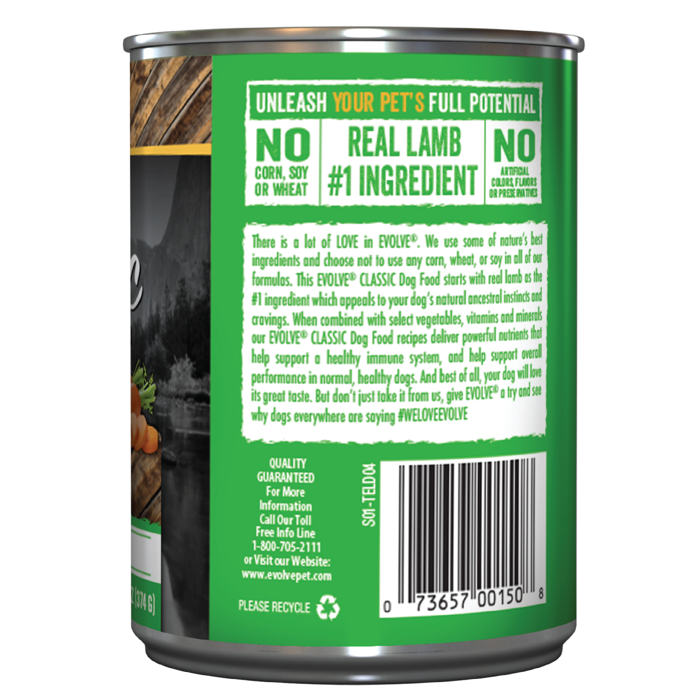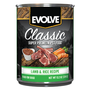 Evolve Classic Lamb & Rice Recipe canned food contains the right protein, carbohydrates, fats, vitamins and minerals carefully combined and slowly cooked in broth to provide a complete and balanced meal for your dog. Plus, they have a delicious flavor dogs love! Choose More. Choose Evolve.