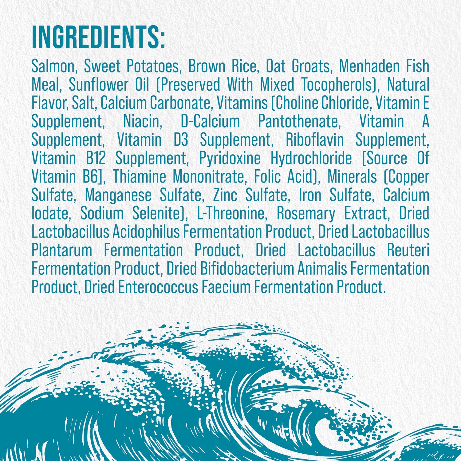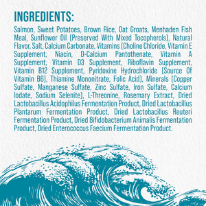 SALMON, SWEET POTATOES, BROWN RICE, OAT GROATS, MENHADEN FISH MEAL, SUNFLOWER OIL (PRESERVED WITH MIXED TOCOPHEROLS), NATURAL FLAVOR, SALT, CALCIUM CARBONATE, VITAMINS [CHOLINE CHLORIDE, VITAMIN E SUPPLEMENT, NIACIN, D-CALCIUM PANTOTHENATE, VITAMIN A SUPPLEMENT, VITAMIN D3 SUPPLEMENT, RIBOFLAVIN SUPPLEMENT, VITAMIN B12 SUPPLEMENT, PYRIDOXINE HYDROCHLORIDE [SOURCE OF VITAMIN B6], THIAMINE MONONITRATE, FOLIC ACID), ASCORBIC ACID, MINERALS (COPPER SULFATE, MANGANESE SULFATE, ZINC SULFATE, IRON SULFATE, CALCIUM LODATE, SODIUM SELENITE), L-THREONINE, ROSEMARY EXTRACT.Guaranteed Analysis