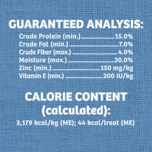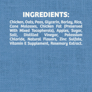 Chicken, Oats, Peas, Glycerin, Barley, Rice, Cane Molasses, Chicken Fat (Preserved With Mixed Tocopherols), Apples, Sugar, Salt, Distilled Vinegar, Potassium Chloride, Natural Flavors, Zinc Sulfate, Vitamin E Supplement, Rosemary ExtractGuaranteed Analysis