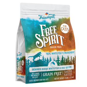 Triumph Free Spirit Grain Free formulas are crafted with nature's best ingredients including easy to digest complex carbohydrates which offer a healthy alternative to grains. Triumph Free Spirit Grain Free Ocean Whitefish & Egg Recipe starts with real deboned Ocean Whitefish as the #1 ingredient which appeals to your cat's natural ancestral instincts and true cravings. When combined with select vegetables, fruits, vitamins, and minerals our Triumph Free Spirit Grain Free Ocean Whitefish & Egg Recipe delivers powerful nutrients and antioxidants that help support a healthy immune system, help maintain a healthy skin and coat, and help support overall good health. And best of all your cat will naturally love it's great taste. Awaken your cat's Free Spirit!