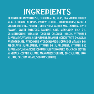 DEBONED OCEAN WHITEFISH, CHICKEN MEAL, PEAS, PEA STARCH, TURKEY MEAL, CHICKEN FAT (PRESERVED WITH MIXED TOCOPHEROLS), TAPIOCA STARCH, DRIED EGG PRODUCT, DRIED YEAST, CANOLA MEAL, NATURAL LIVER FLAVOR, SWEET POTATOES, TAURINE, SALT, MENHADEN FISH OIL, DL-METHIONINE, VITAMINS (CHOLINE CHLORIDE, NIACIN, VITAMIN E SUPPLEMENT, VITAMIN A SUPPLEMENT, THIAMINE MONONITRATE, D-CALCIUM PANTOTHENATE, PYRIDOXINE HYDROCHLORIDE (SOURCE OF VITAMIN B6), RIBOFLAVIN SUPPLEMENT, VITAMIN D3 SUPPLEMENT, VITAMIN B12 SUPPLEMENT, MENADIONE SODIUM BISULFITE COMPLEX, FOLIC ACID, BIOTIN), MINERALS (COPPER SULFATE, MANGANESE SULFATE, ZINC SULFATE, IRON SULFATE, CALCIUM IODATE, SODIUM SELENITE).Guaranteed Analysis