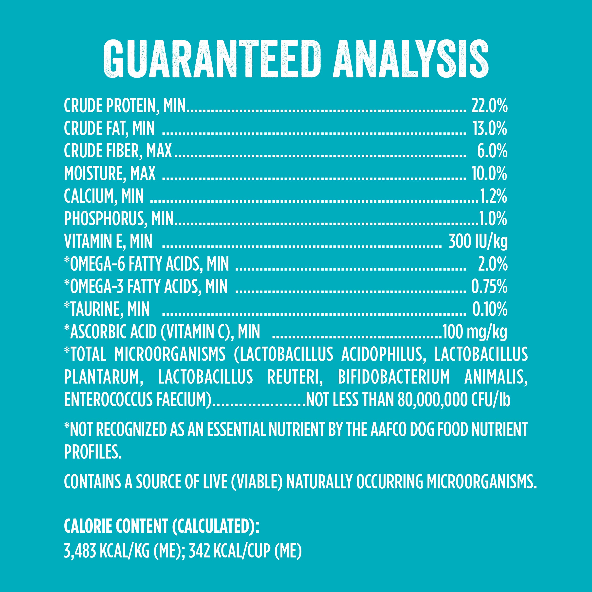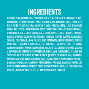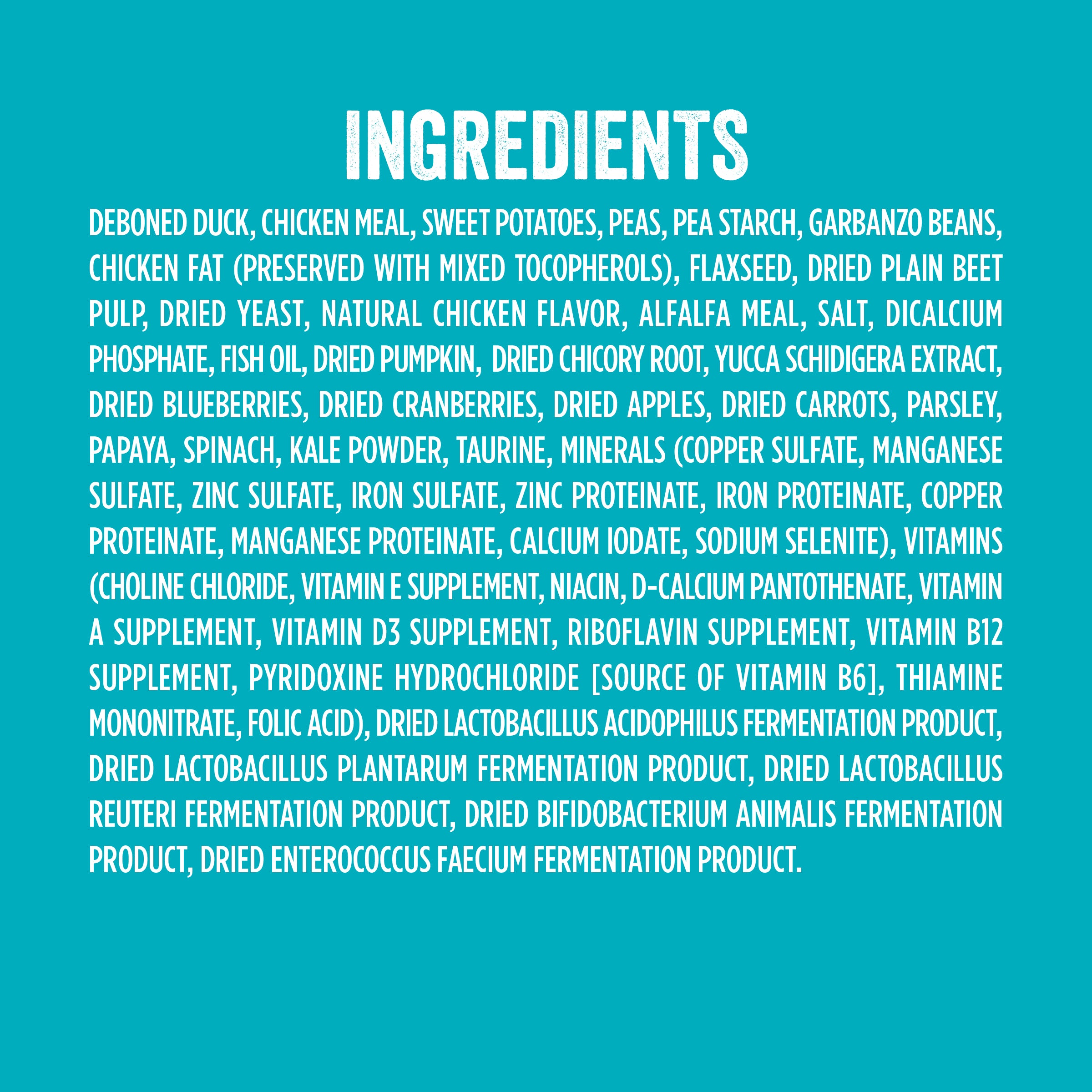 Deboned Duck, Chicken Meal, Sweet Potatoes, Peas, Pea Starch, Garbanzo Beans, Chicken Fat (Preserved With Mixed Tocopherols), Flaxseed, Dried Plain Beet Pulp, Dried Yeast, Natural Chicken Flavor, Alfalfa Meal, Salt, Dicalcium Phosphate, Fish Oil, Dried Pumpkin, Dried Chicory Root, Yucca Schidigera Extract, Dried Blueberries, Dried Cranberries, Dried Apples, Dried Carrots, Parsley, Papaya, Spinach, Kale Powder, Taurine, Minerals (Copper Sulfate, Manganese Sulfate, Zinc Sulfate, Iron Sulfate, Zinc Proteinate, Iron Proteinate, Copper Proteinate, Manganese Proteinate, Calcium Iodate, Sodium Selenite), Vitamins (Choline Chloride, Vitamin E Supplement, Niacin, D-calcium Pantothenate, Vitamin A Supplement, Vitamin D3 Supplement, Riboflavin Supplement, Vitamin B12 Supplement, Pyridoxine Hydrochloride [source Of Vitamin B6], Thiamine Mononitrate, Folic Acid), Dried Lactobacillus Acidophilus Fermentation Product, Dried Lactobacillus Plantarum Fermentation Product, Dried Lactobacillus Reuteri Fermentation Product, Dried Bifidobacterium Animalis Fermentation Product, Dried Enterococcus Faecium Fermentation Product.Guaranteed Analysis