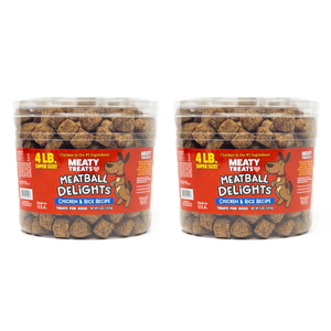 Meaty Treats Meatball Delights Chicken Flavored Meatballs are a delightful, in between meal snack that your dog will love. Because we care about the quality of our pet treats, we chose to use real chicken in this unique formulation. This tasty snack has an eye appealing meatball shape and chewy texture that will entice your dog to want more. Plus, the chicken flavor creates a mouth watering aroma that your dog will find irresistible. By choosing to feed your best friend Meaty Treats Meatball Delights Chicken Flavored Meatballs, you are choosing a bright future for your pet!