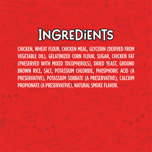 Chicken, Wheat Flour, Chicken Meal, Glycerin (Derived from Vegetable Oil), Gelatinized Corn Flour, Sugar, Chicken Fat (Preserved with Mixed Tocopherols), Dried Yeast, Ground Brown Rice, Salt, Potassium Chloride, Phosphoric Acid (a Preservative), Potassium Sorbate (a Preservative), Calcium Propionate (a Preservative), Natural Smoke Flavor.Guaranteed Analysis