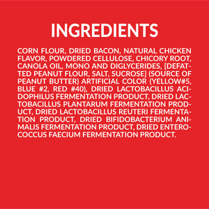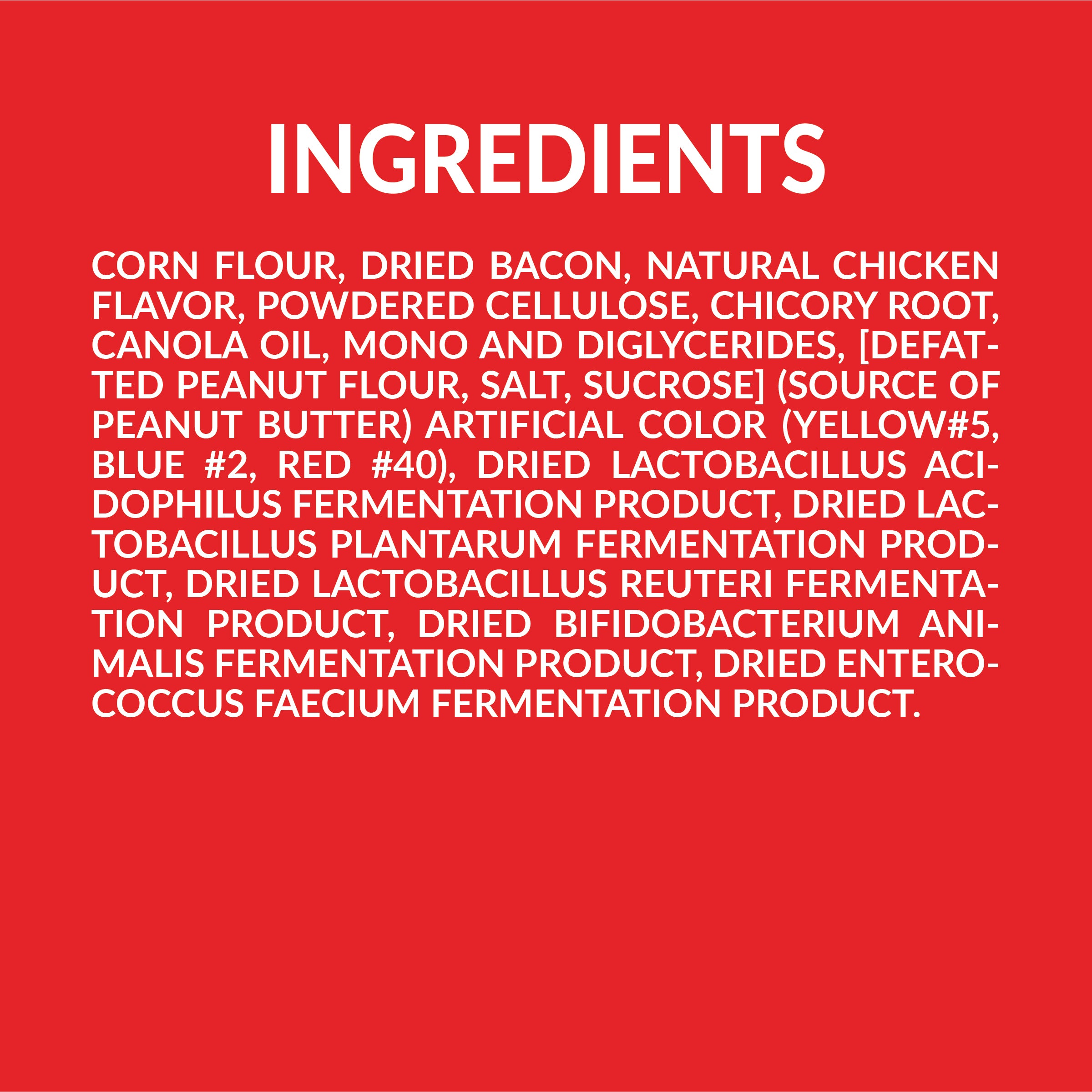 Corn Flour, Dried Bacon, Natural Chicken Flavor, Powdered Cellulose, Chicory Root, Canola Oil, Mono And Diglycerides, [Defatted Peanut Flour, Salt, Sucrose] (Source of Peanut Butter) Artificial Color (Yellow#5, Blue #2, Red #40), Dried Lactobacillus Acidophilus Fermentation Product, Dried Lactobacillus Plantarum Fermentation Product, Dried Lactobacillus Reuteri Fermentation Product, Dried Bifidobacterium Animalis Fermentation Product, Dried Enterococcus Faecium Fermentation Product.Guaranteed Analysis
