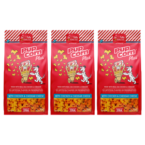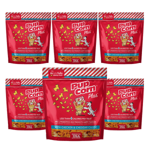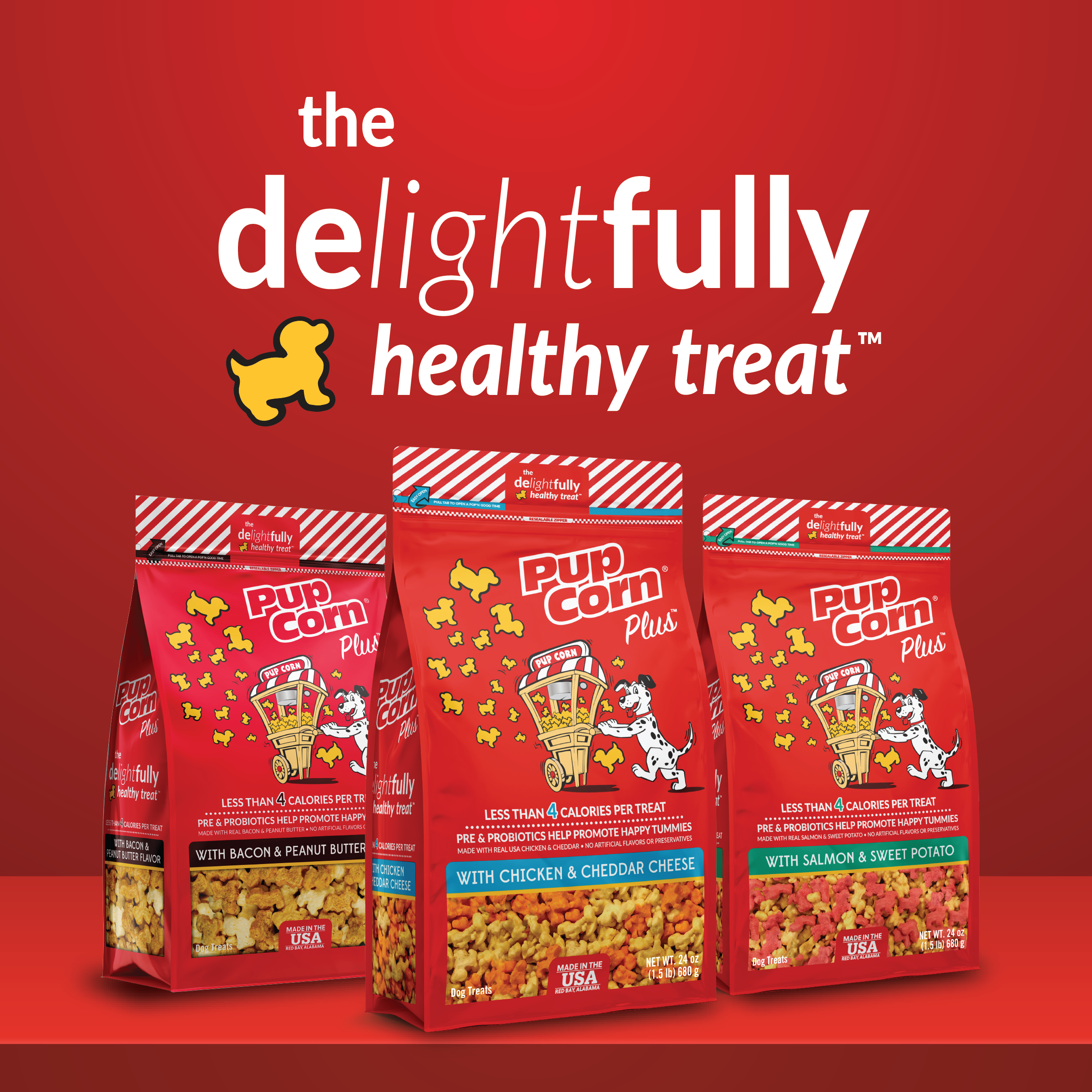 Pup Corn Plus is the deLIGHTfully healthy treat you can give your dog without the worry of overfeeding. At under 4 calories per treat, these low fat crunchy puffs are simply guilt-free. The Plus in Pup Corn Plus means we've included natural pre- and probiotics for happy & healthy tummies. Each and every batch is made in our family owned and operated kitchens in the USA with North American ingredients. With delicious flavors like Chicken & Cheddar, Bacon & Beef, and Salmon, the hardest part will be choosing which flavor to try next! Join happy dogs across the country living their best life with Pup Corn Plus dog treats today!