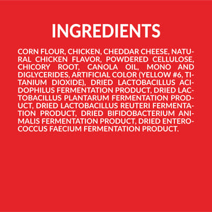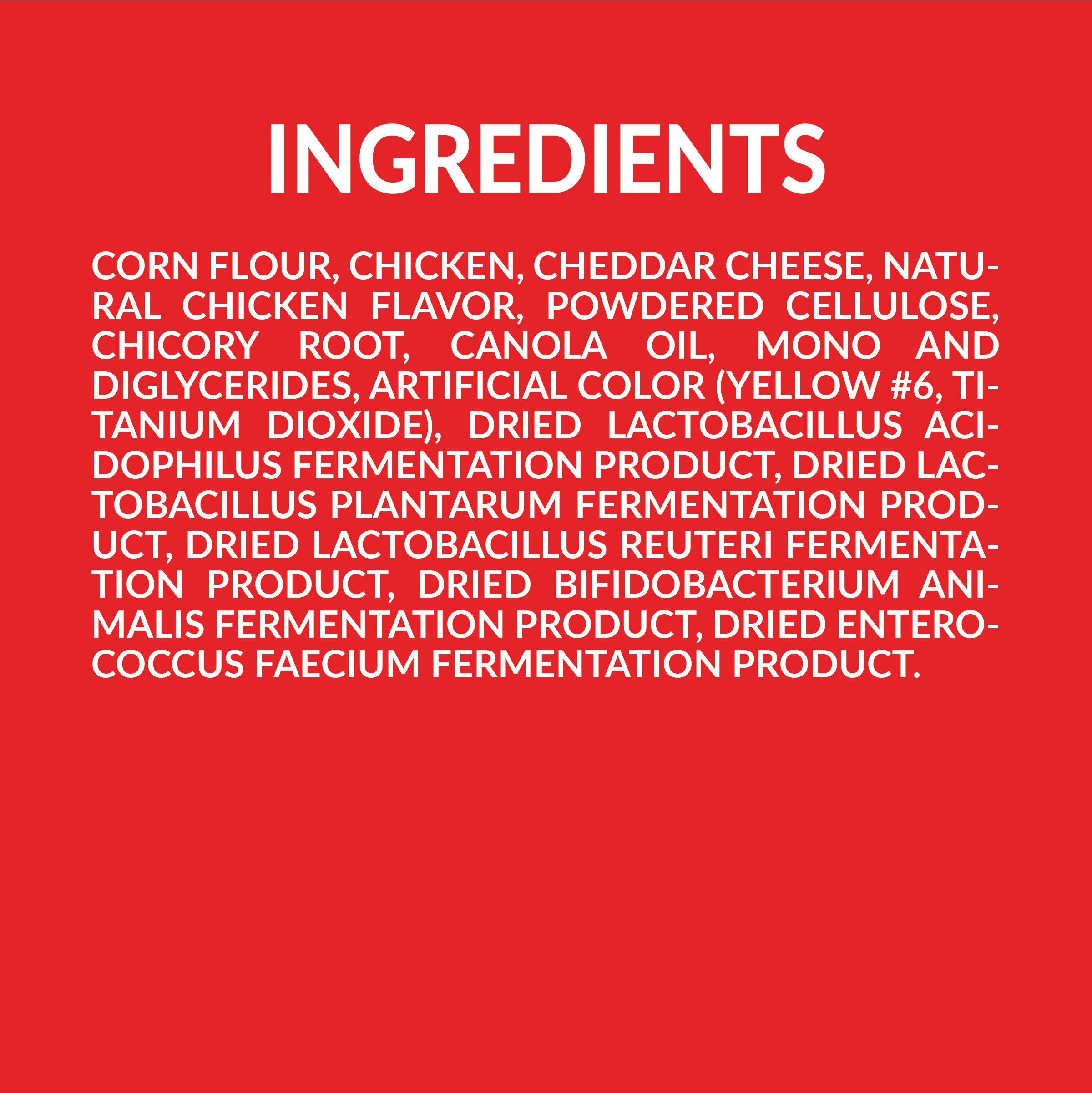 Corn Flour, Chicken, Cheddar Cheese, Natural Chicken Flavor, Powdered Cellulose, Chicory Root, Canola Oil, Mono and Diglycerides, Artificial Color (Yellow #6, Titanium Dioxide), Dried Lactobacillus Acidophilus Fermentation Product, Dried Lactobacillus Plantarum Fermentation Product, Dried Lactobacillus Reuteri Fermentation Product, Dried Bifidobacterium Animalis Fermentation Product, Dried Enterococcus Faecium Fermentation Product.Guaranteed Analysis