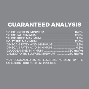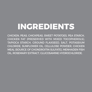 Chicken, Peas, Chickpeas, Sweet Potatoes, Pea Starch, Chicken Fat (Preserved with Mixed Tocopherols), Tapioca Starch, Ground Flaxseed, Salt, Potassium Chloride, Sunflower Oil, Cellulose Powder, Chicken Meal (Source of Chondroitin Sulfate), Menhaden Fish Oil, Rosemary Extract, Glucosamine Hydrochloride.Guaranteed Analysis