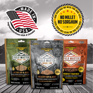 Sportsman's Pride Field Master Grain Free Dog Treats are the go-to training & rewarding tools trusted by legends. True masters of their craft.Β For dogs with food sensitivities, our natural Grain Free formulas are a great choice. Optimized for performance, these treats start with the main protein as the #1 ingredient. Every formula is crafted by experts for optimum rewarding and dependability right here in the USA. Natural Dog Treats with No Corn, Wheat, Soy, Millet, or Sorghum & the best ingredients in the field. Made with our exclusive Omega Pride Skin & Coat System because a proper balance of Omega fatty acids is essential for good immune function, increased skin moisture, and an improved hair coat. Outstanding performance for any champion and a healthy, happy dog.
