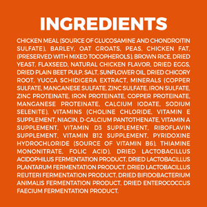CHICKEN MEAL (SOURCE OF GLUCOSAMINE AND CHONDROITIN SULFATE), BARLEY, OAT GROATS, PEAS, CHICKEN FAT, (PRESERVED WITH MIXED TOCOPHEROLS), BROWN RICE, DRIED YEAST, FLAXSEED, NATURAL CHICKEN FLAVOR, DRIED EGGS, DRIED PLAIN BEET PULP, SALT, SUNFLOWER OIL, DRIED CHICORY ROOT, YUCCA SCHIDIGERA EXTRACT, MINERALS (COPPER SULFATE, MANGANESE SULFATE, ZINC SULFATE, IRON SULFATE, ZINC PROTEINATE, IRON PROTEINATE, COPPER PROTEINATE, MANGANESE PROTEINATE, CALCIUM IODATE, SODIUM SELENITE), VITAMINS (CHOLINE CHLORIDE, VITAMIN E SUPPLEMENT, NIACIN, D-CALCIUM PANTOTHENATE, VITAMIN A SUPPLEMENT, VITAMIN D3 SUPPLEMENT, RIBOFLAVIN SUPPLEMENT, VITAMIN B12 SUPPLEMENT, PYRIDOXINE HYDROCHLORIDE (SOURCE OF VITAMIN B6), THIAMINE MONONITRATE, FOLIC ACID), DRIED LACTOBACILLUS ACIDOPHILUS FERMENTATION PRODUCT, DRIED LACTOBACILLUS PLANTARUM FERMENTATION PRODUCT, DRIED LACTOBACILLUS REUTERI FERMENTATION PRODUCT, DRIED BIFIDOBACTERIUM ANIMALIS FERMENTATION PRODUCT, DRIED ENTEROCOCCUS FAECIUM FERMENTATION PRODUCT.Guaranteed Analysis