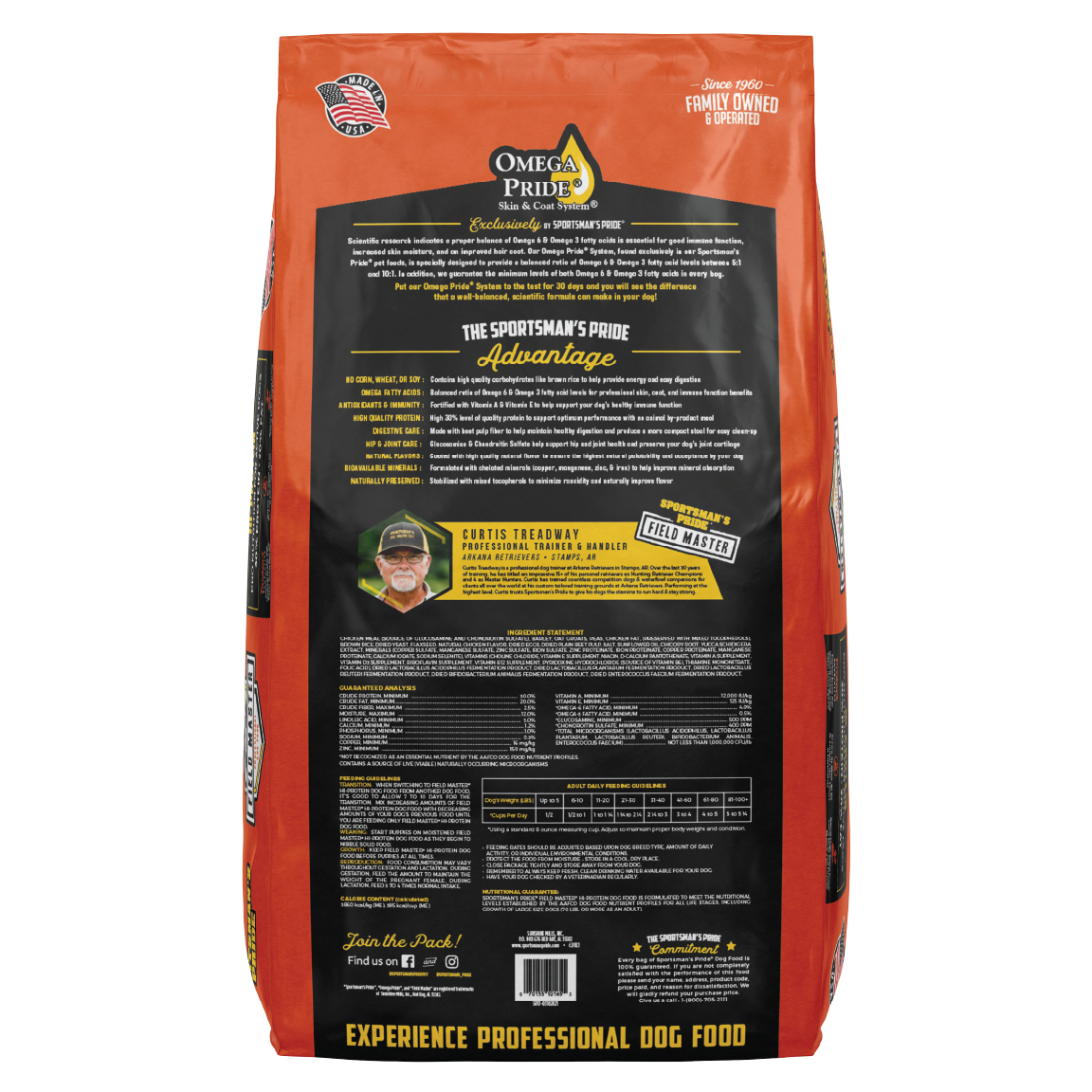 Sportsman's Pride Field Master Dog Foods are trusted by legends. True masters of their craft. Every formula is crafted by experts for optimum performance right here in the USA. Natural Dog Food with No Corn, Wheat, Soy, Millet, or Sorghum in the best protein/fat ratios on the field. Count on the high quality protein and optimum fat levels to help promote proper body function, build healthy muscle tissue, and provide stamina second to none. Made with our exclusive Omega Pride Skin & Coat System because a proper balance of Omega fatty acids is essential for good immune function, increased skin moisture, and an improved hair coat. Put our Omega Pride System to the test for 30 Days and you will see the difference that a well balanced, scientific formula can make in your dog! Outstanding performance for any champion and a healthy, happy dog.
